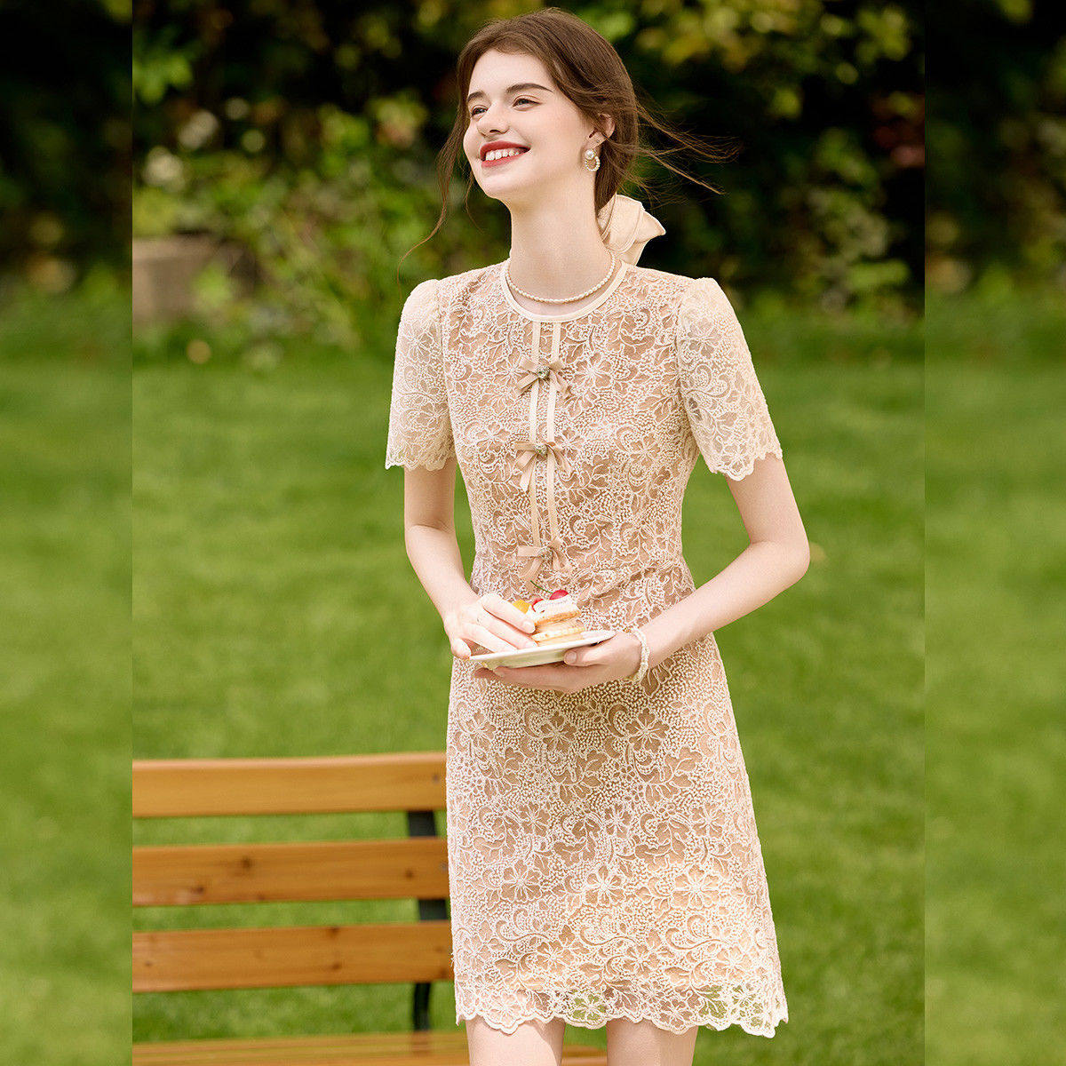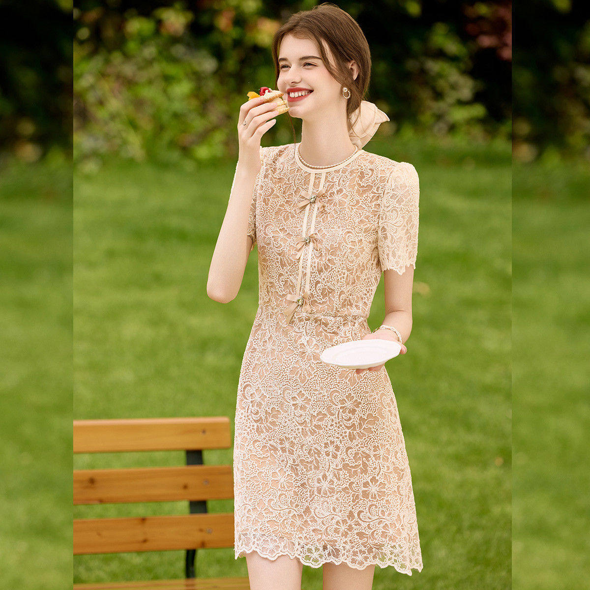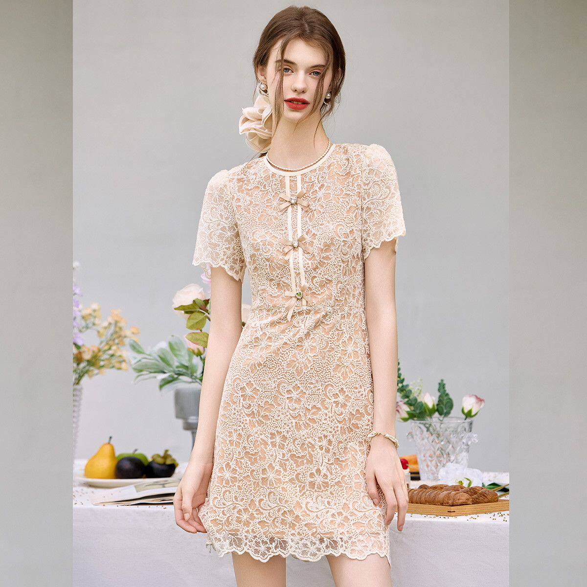 白鹿语高级感蕾丝中长裙2025夏季新款法式复古收腰显瘦洋气连衣裙