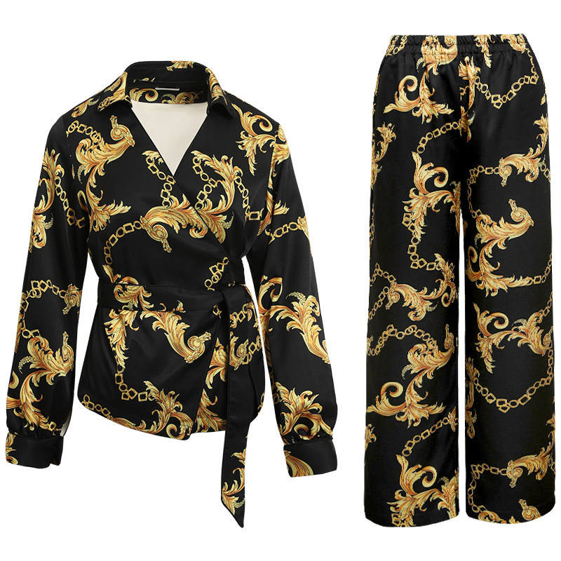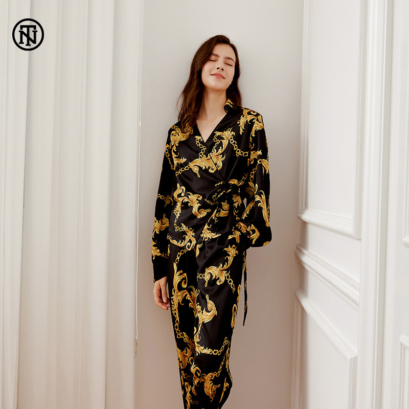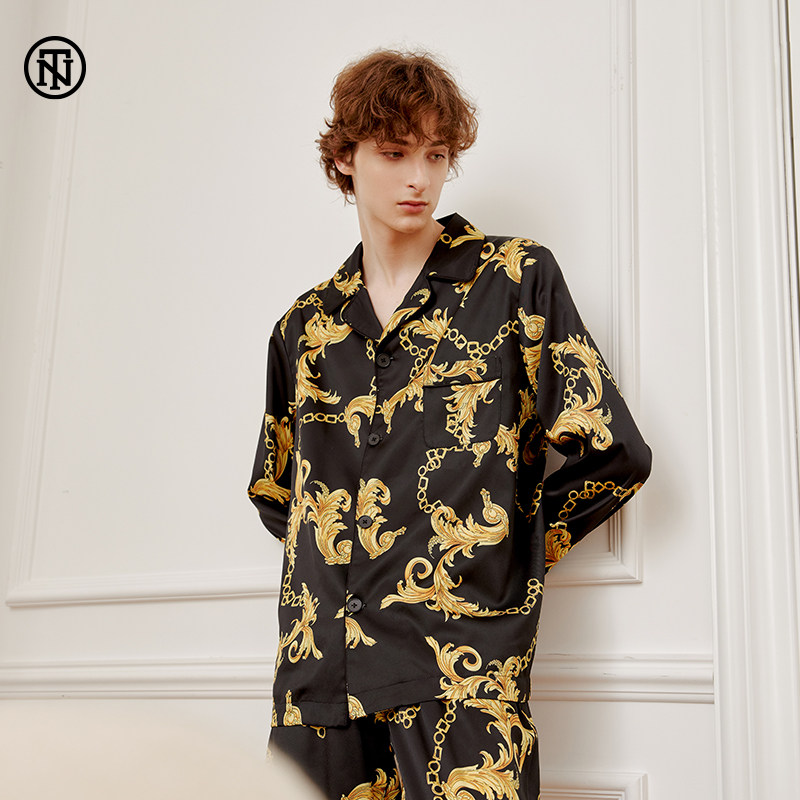 NoirTease奈黎诗春秋丝质印花睡衣情侣翻领长袖家居服两件套装