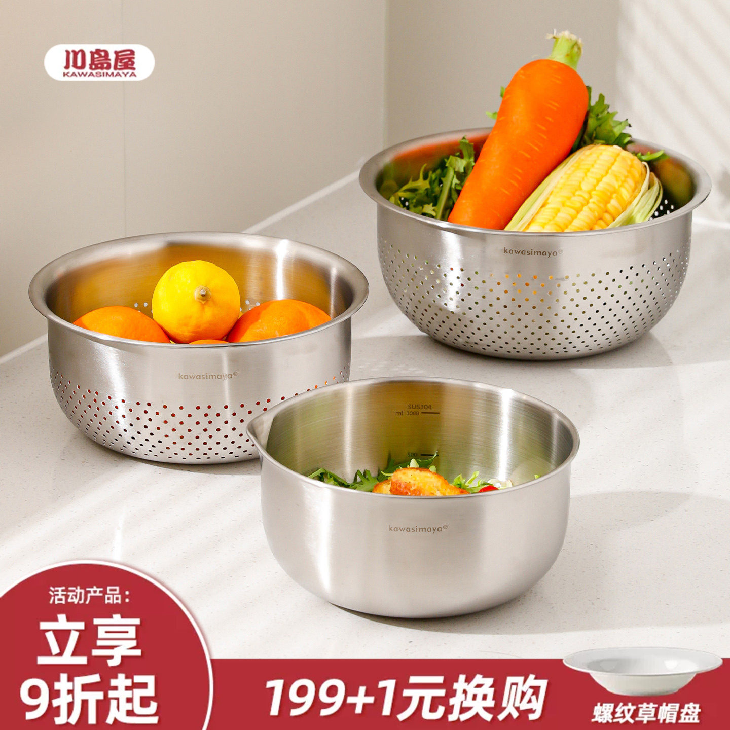 川岛屋不锈钢沥水篮家用厨房洗菜盆水果盘洗奶瓶专用盆和面料理盆