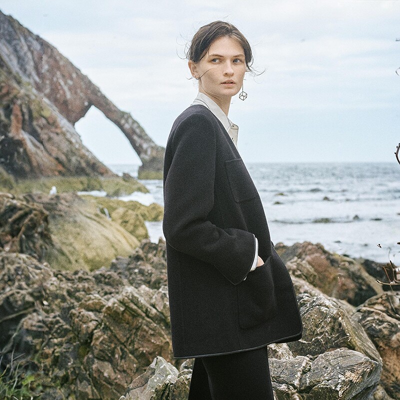 RUISHI芮时重磅驼绒桑蚕丝羊毛慵懒两穿领灰色毛呢大衣秋冬外套女