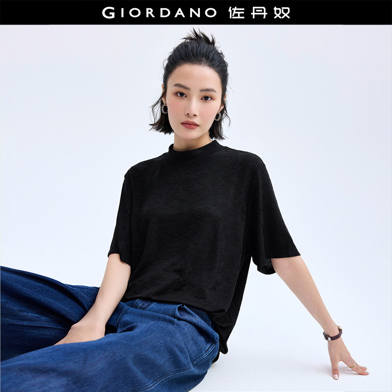 设计师款佐丹奴短袖T恤新款中式提花国风宽松半高领t恤女18325916