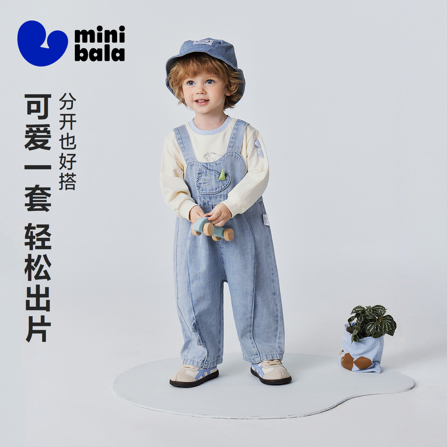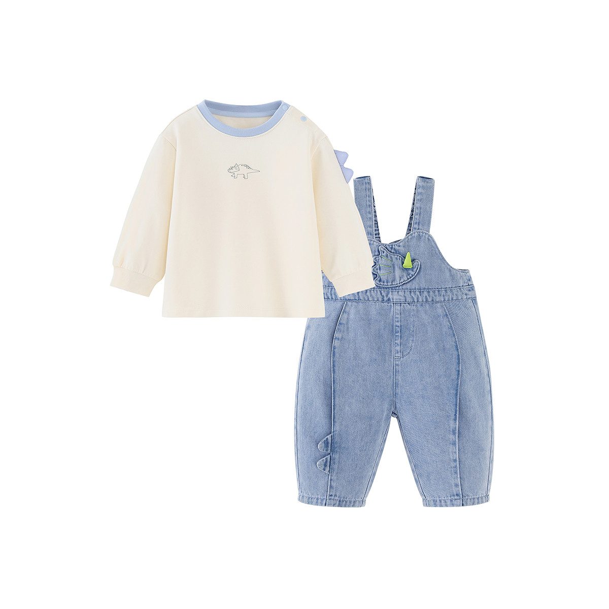 【泉水牛仔】迷你巴拉男童宝宝棉弹T恤牛仔背带裤恐龙造型套装