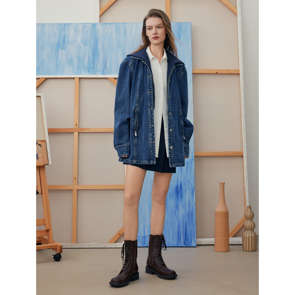 ELLE法式复古牛仔连帽短外套女2025秋季新款小众设计感通勤上衣