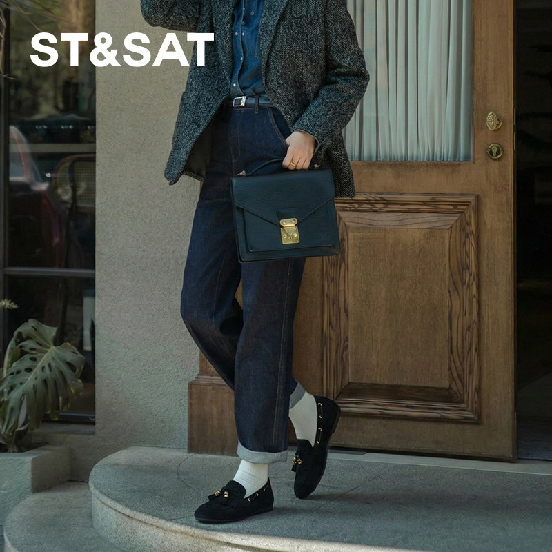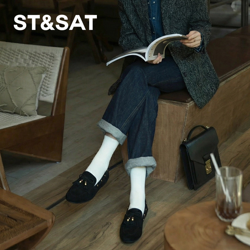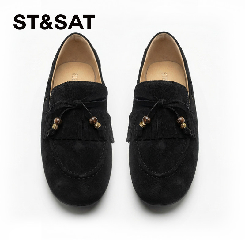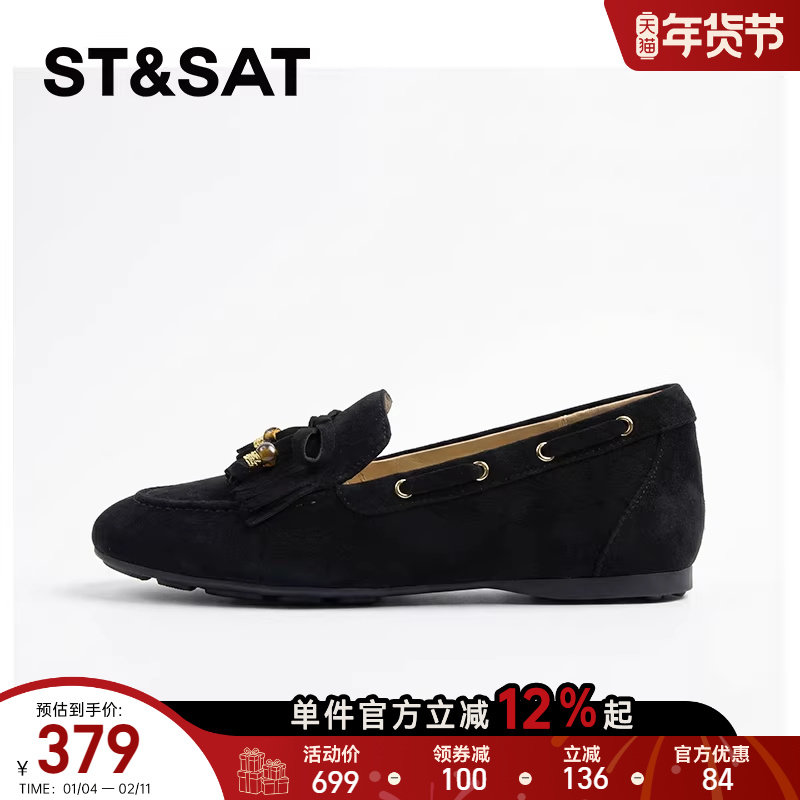 星期六真皮乐福鞋女山茶花新款秋季女鞋平底单鞋英伦风黑色小皮鞋