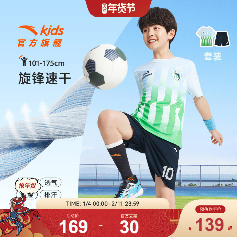 安踏儿童足球服男童套装夏装2025短袖T恤短裤运动两件套透气童装