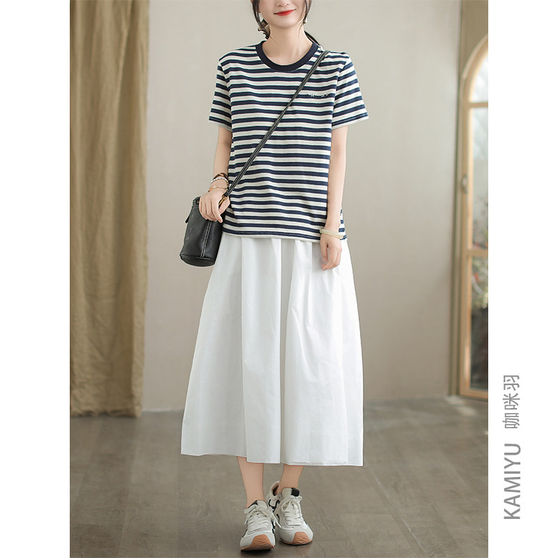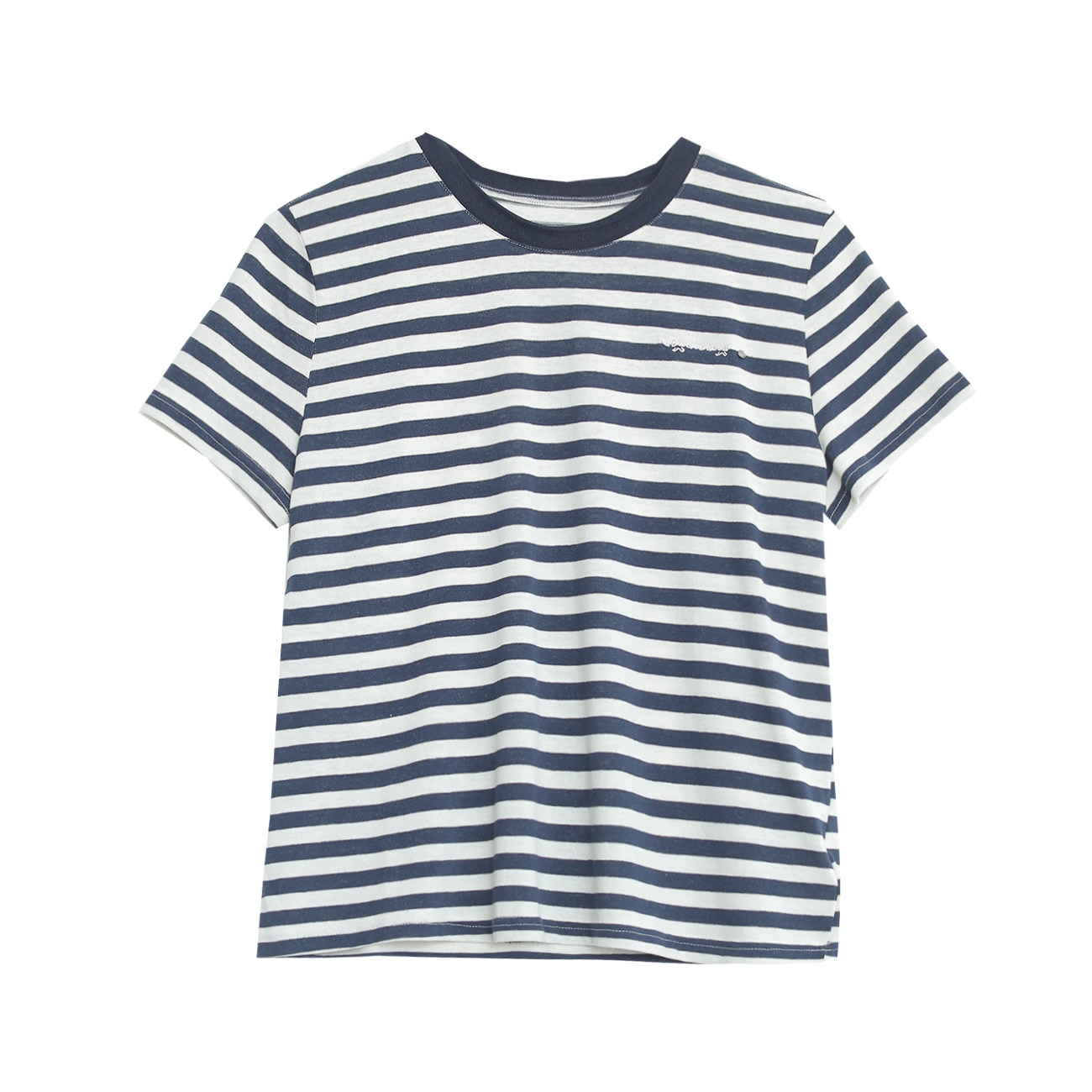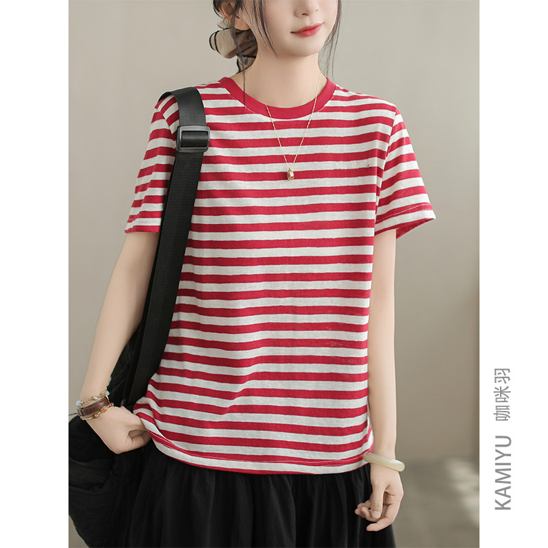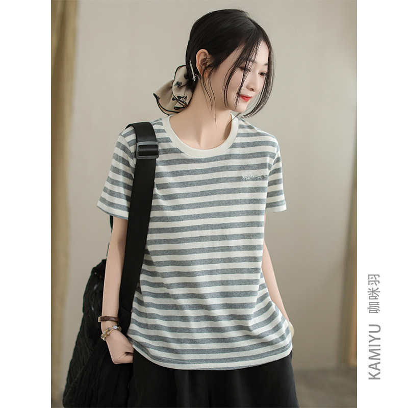 咖咪羽T恤女夏装2025新款圆领休闲条纹百搭复古时尚简约女装短袖