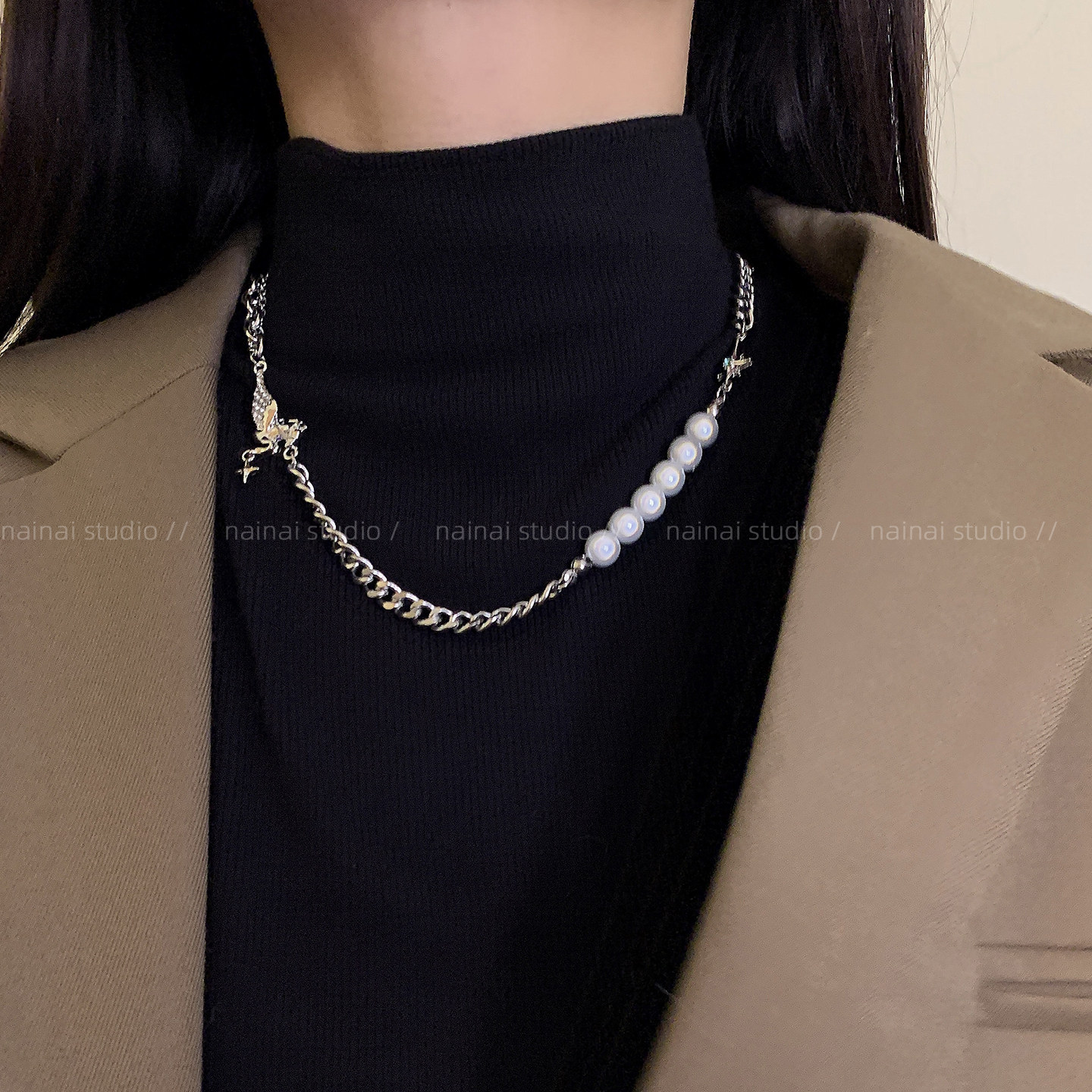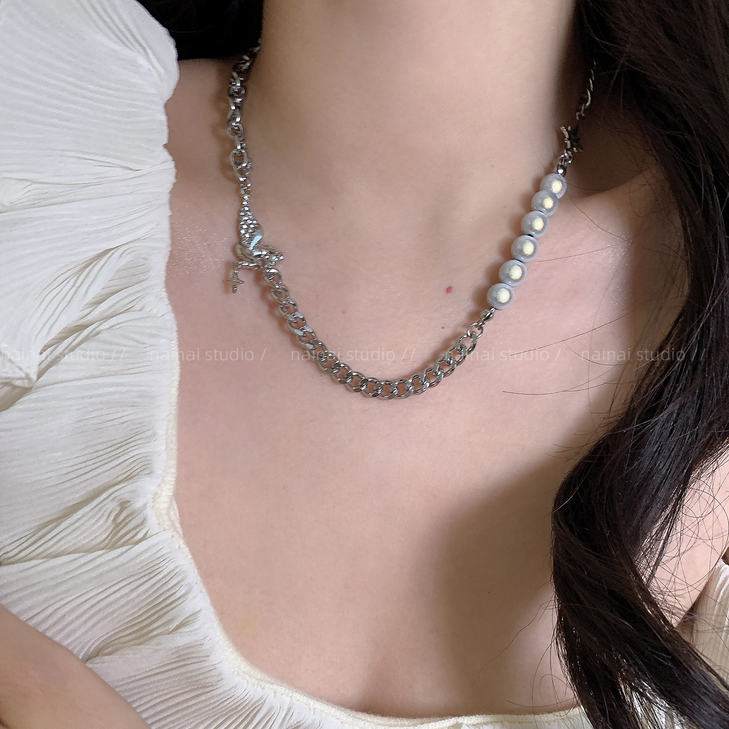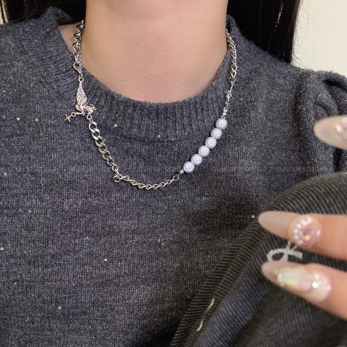 反光珍珠项链~甜酷辣妹锁骨链小众设计感轻奢配饰拼接嘻哈颈链女A