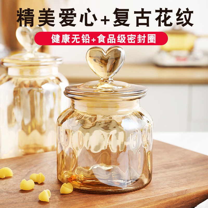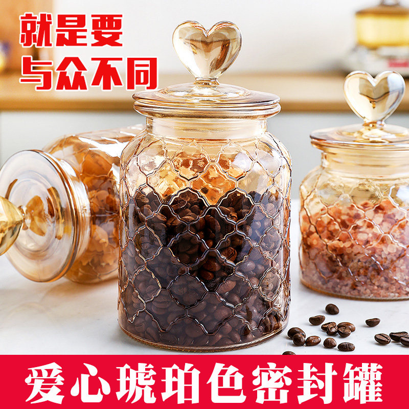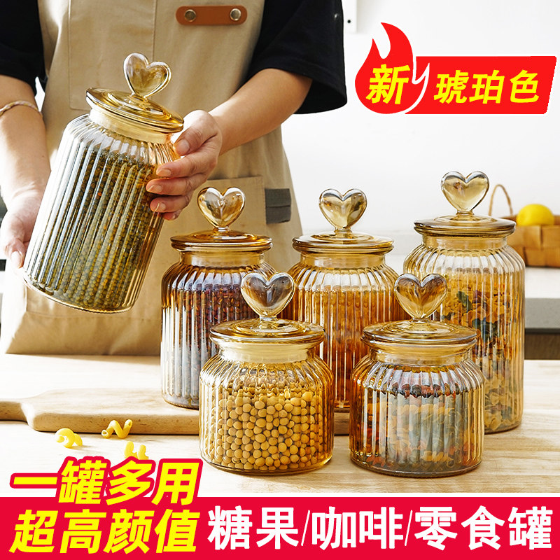 日式风格彩色玻璃密封罐 琥珀色爱心玻璃瓶适用于零食储物泡菜罐