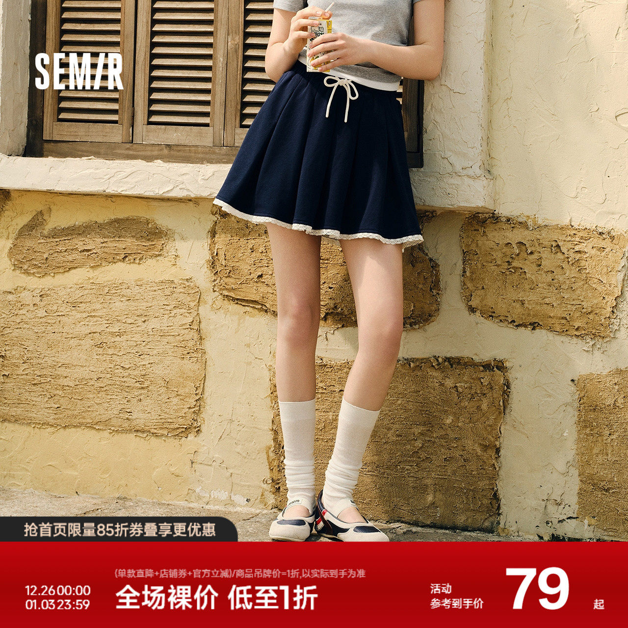 甜美蕾丝花边 遮胯显瘦A字 舒适抽绳松紧腰