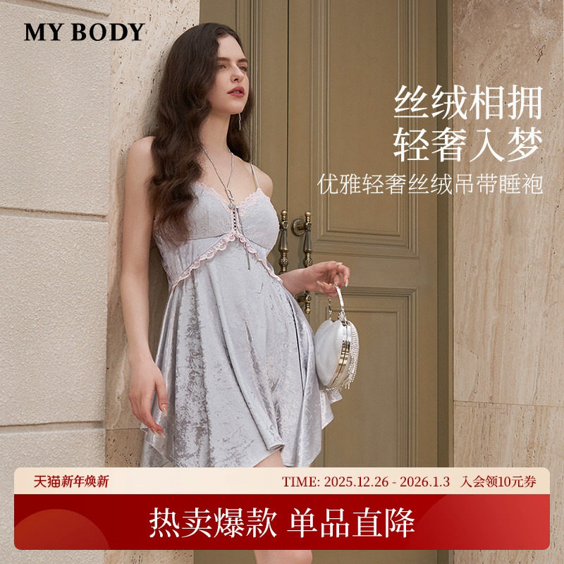 商场同款MYBODY冬季新款睡裙优雅轻奢丝绒蕾丝吊带睡衣睡袍两件套