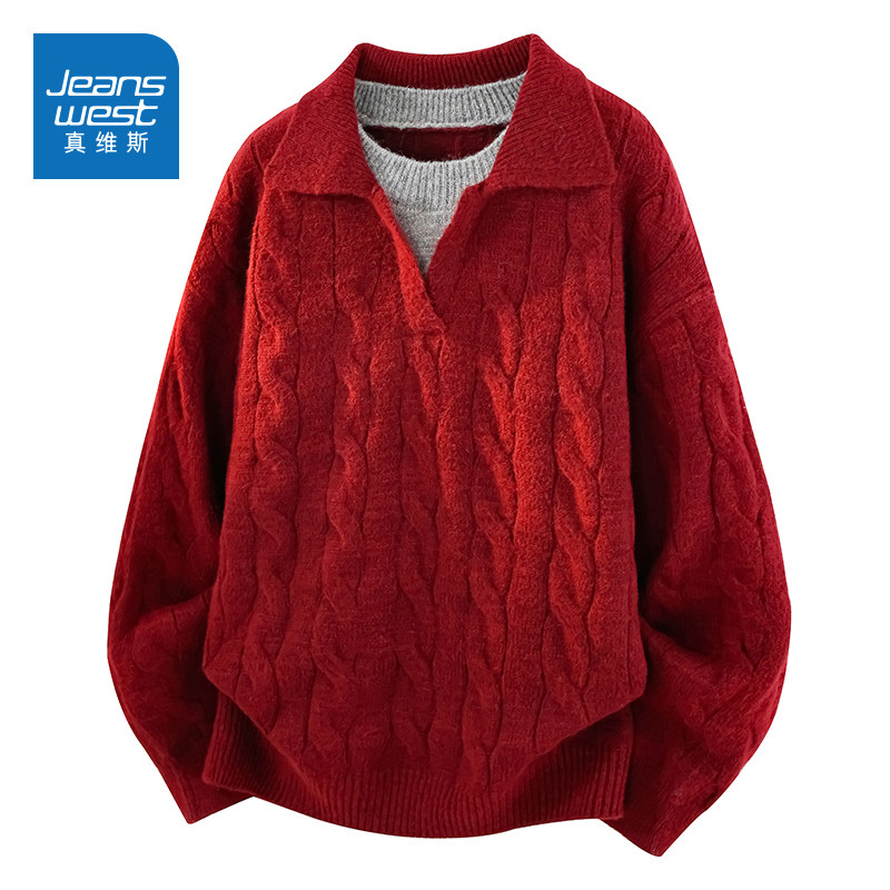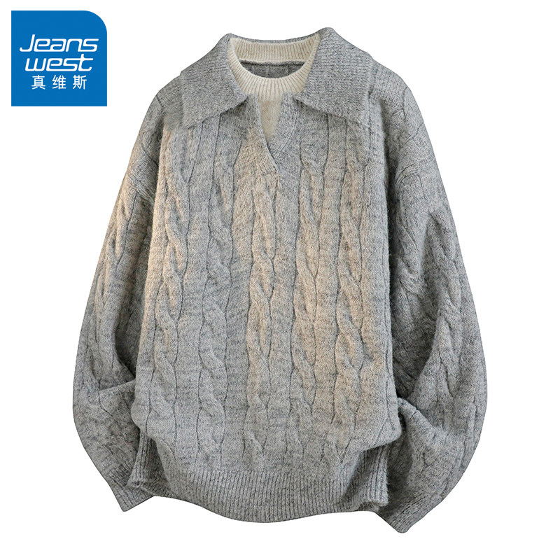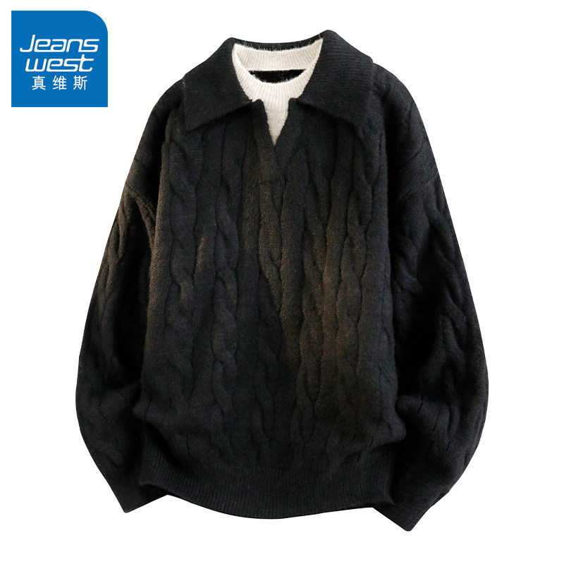 N5真维斯毛衣男2025新款秋冬季美式宽松翻领假两件上衣男款针织衫
