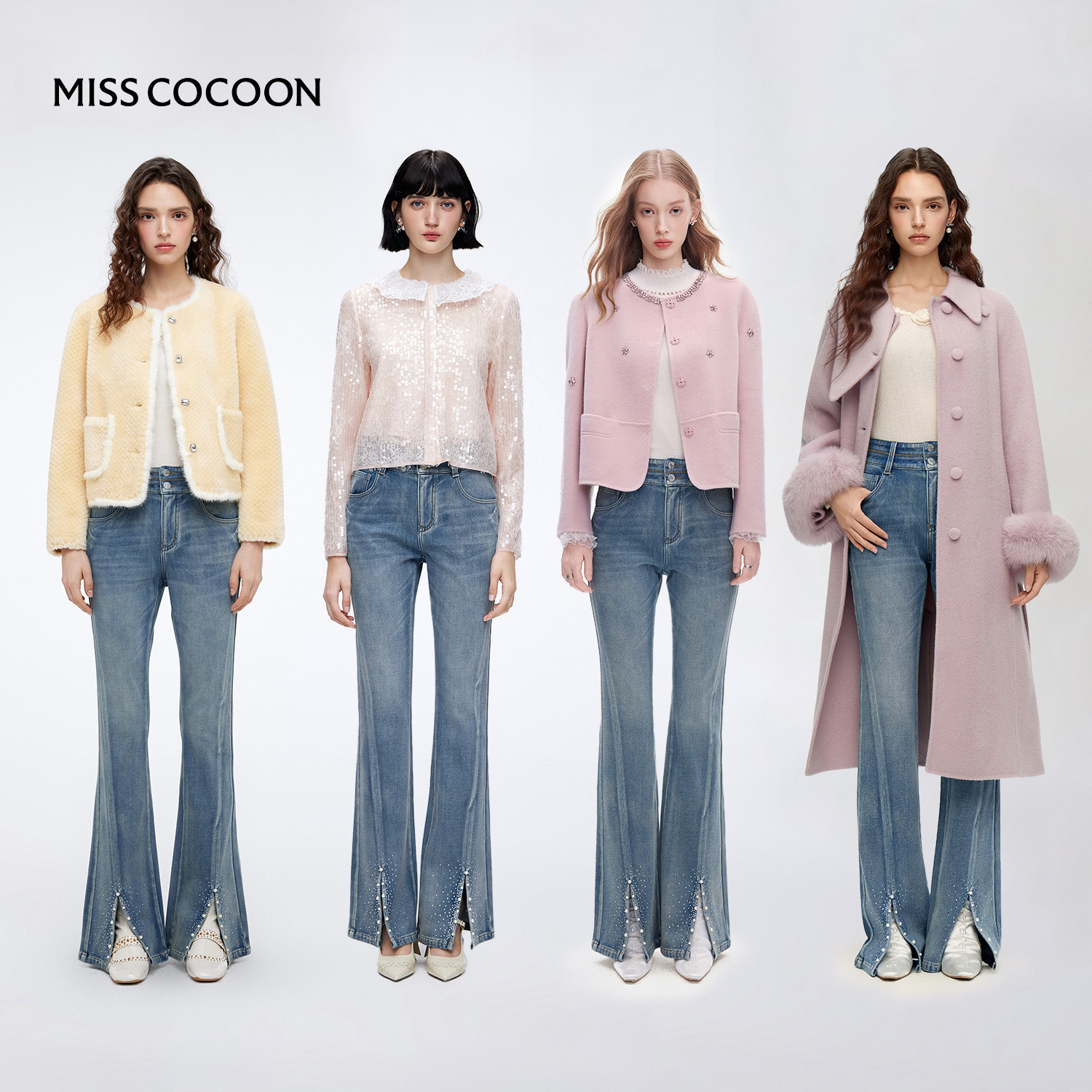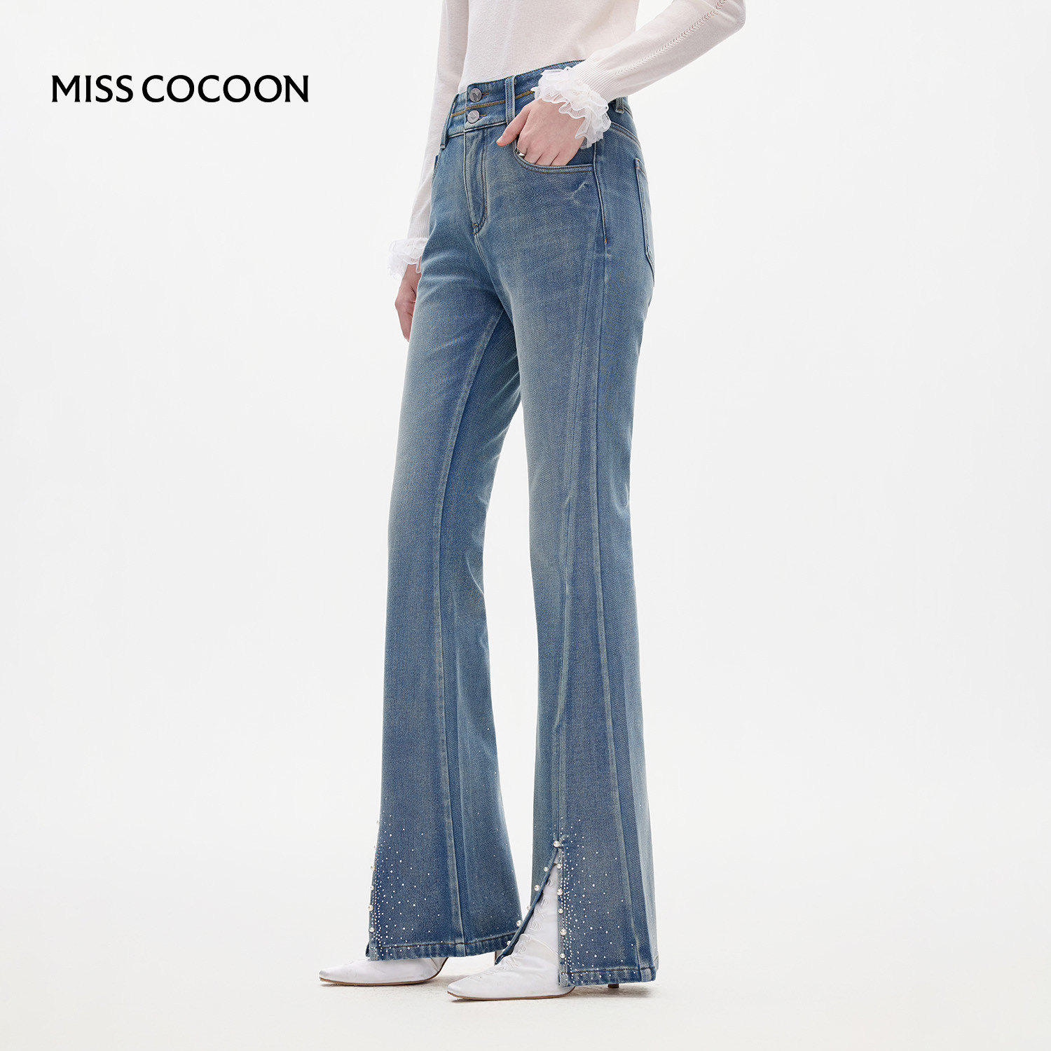 MISSCOCOON可可尼宽松阔腿牛仔裤女2025冬新款复古烫钻弹力喇叭裤
