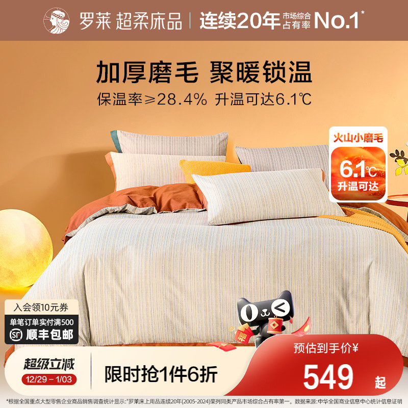 罗莱家纺床上用品磨毛纯棉全棉加厚保暖床单被套双人床四件套