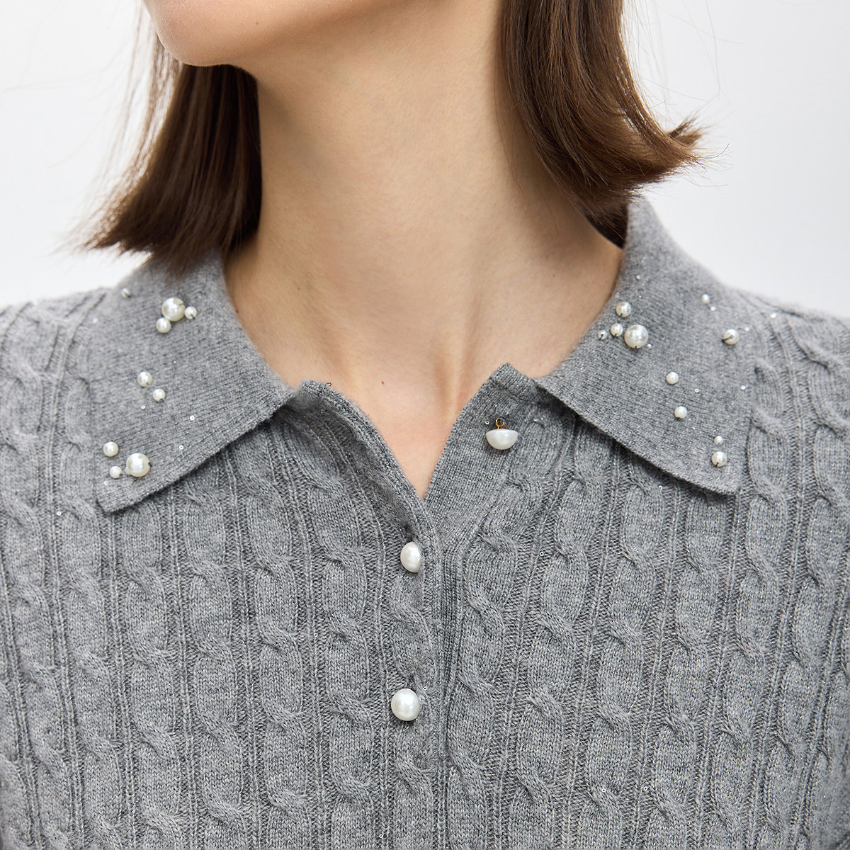LILY2026春秋新款女装含羊毛polo翻领气质通勤条纹长袖针织衫毛衣