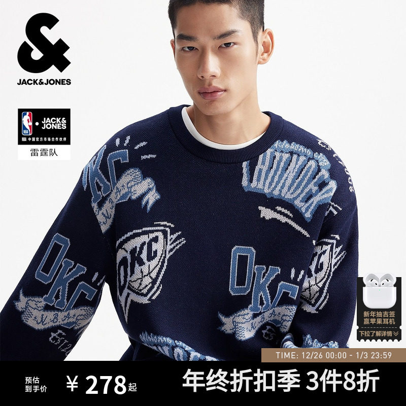 杰克琼斯NBA联名款雷霆队男装冬季新款时尚满印宽松圆领毛针织衫