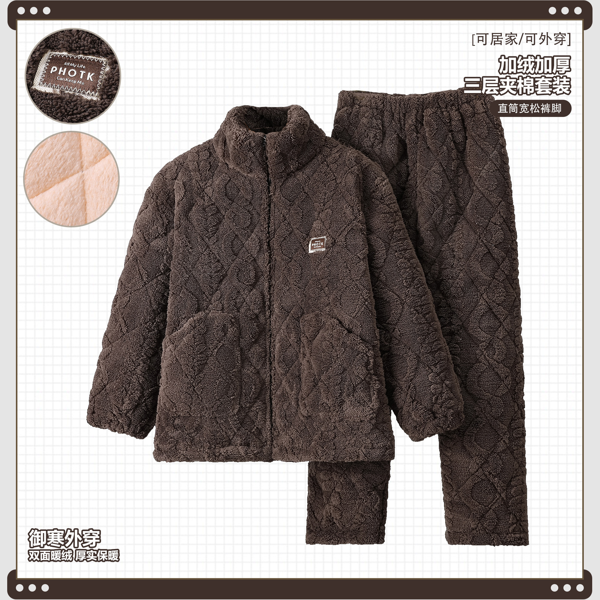 冬季珊瑚绒男士睡衣三层夹棉加厚加绒法兰绒秋冬款家居服保暖套装