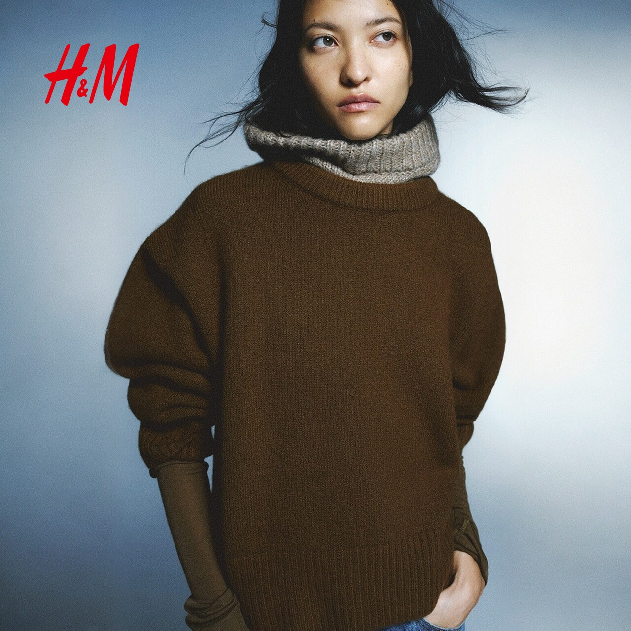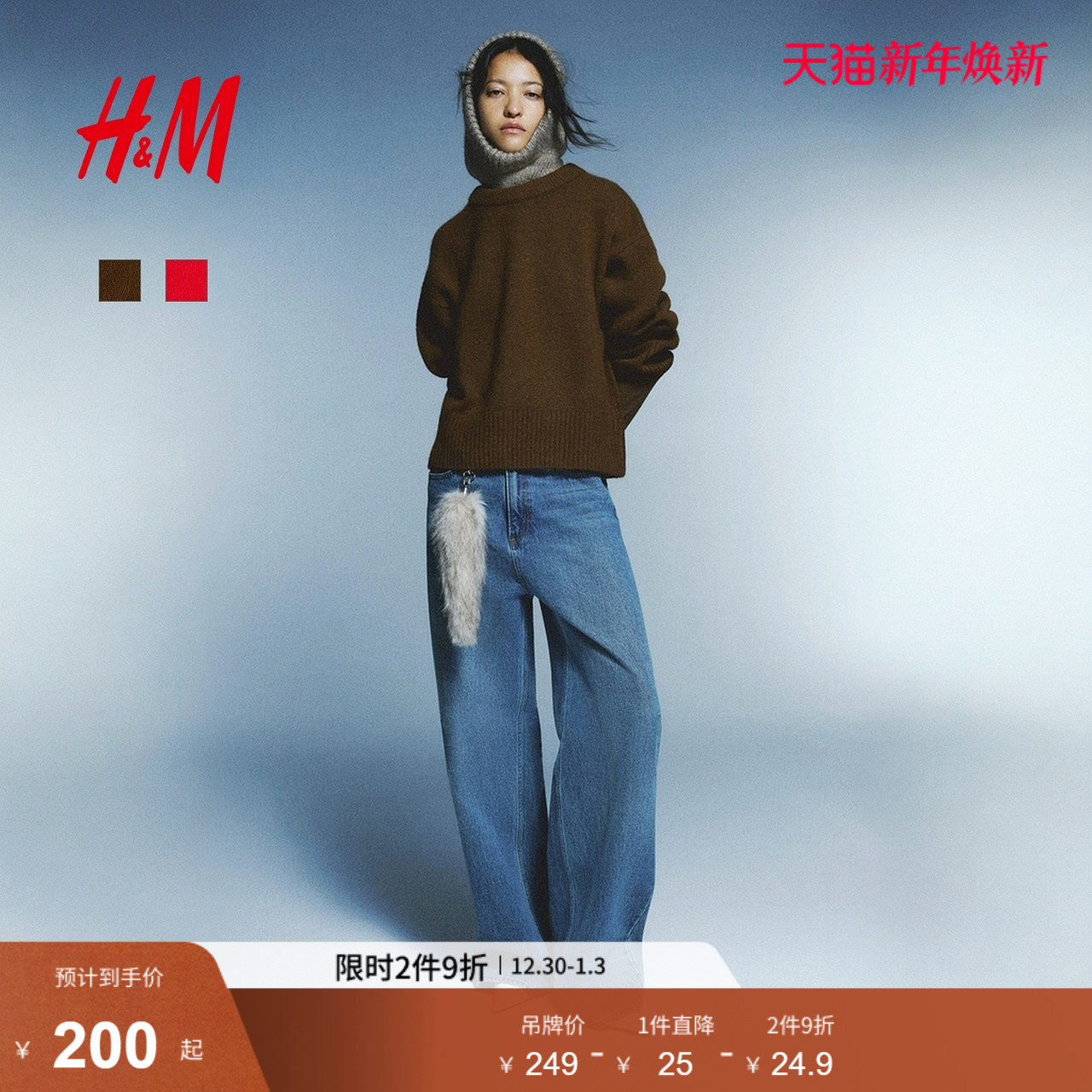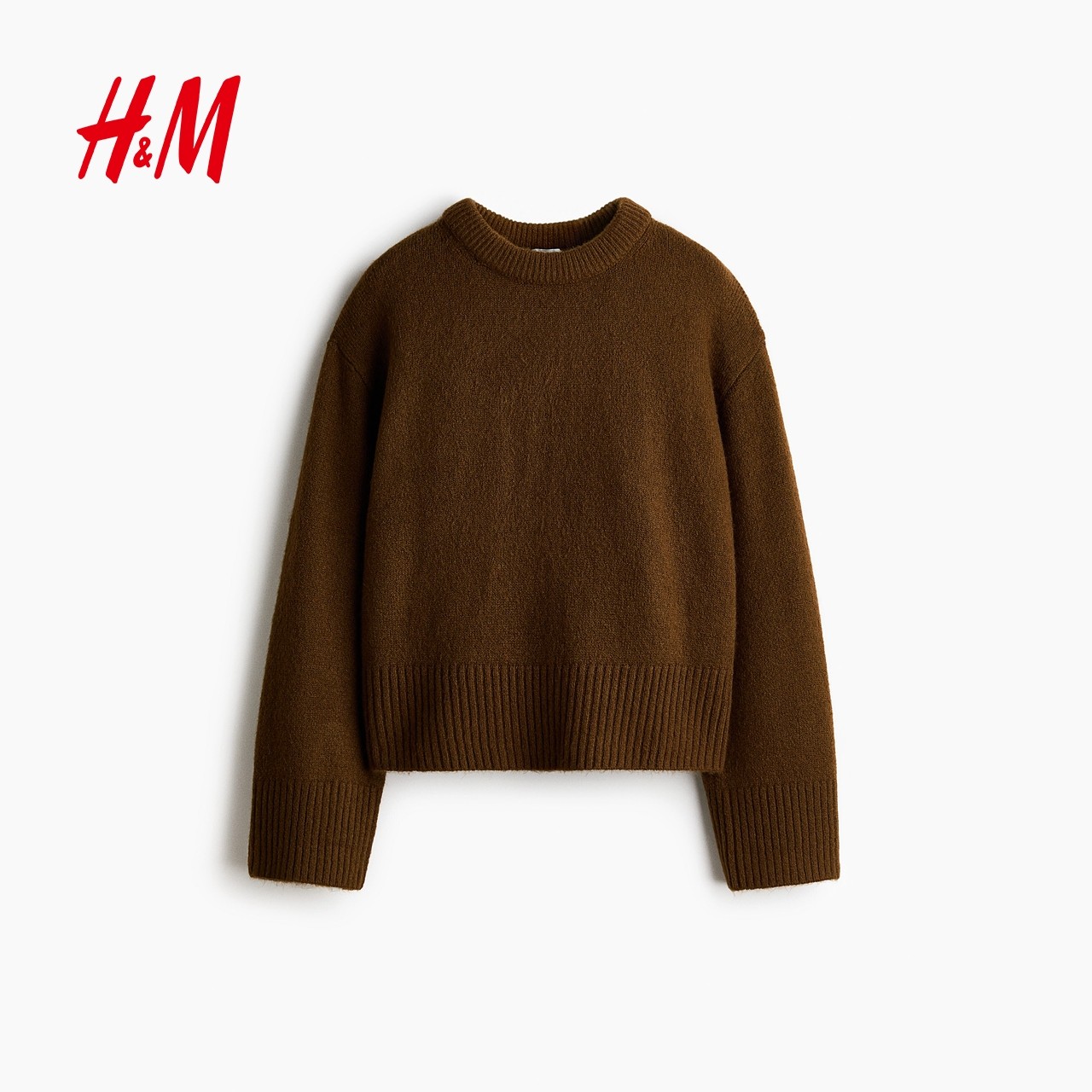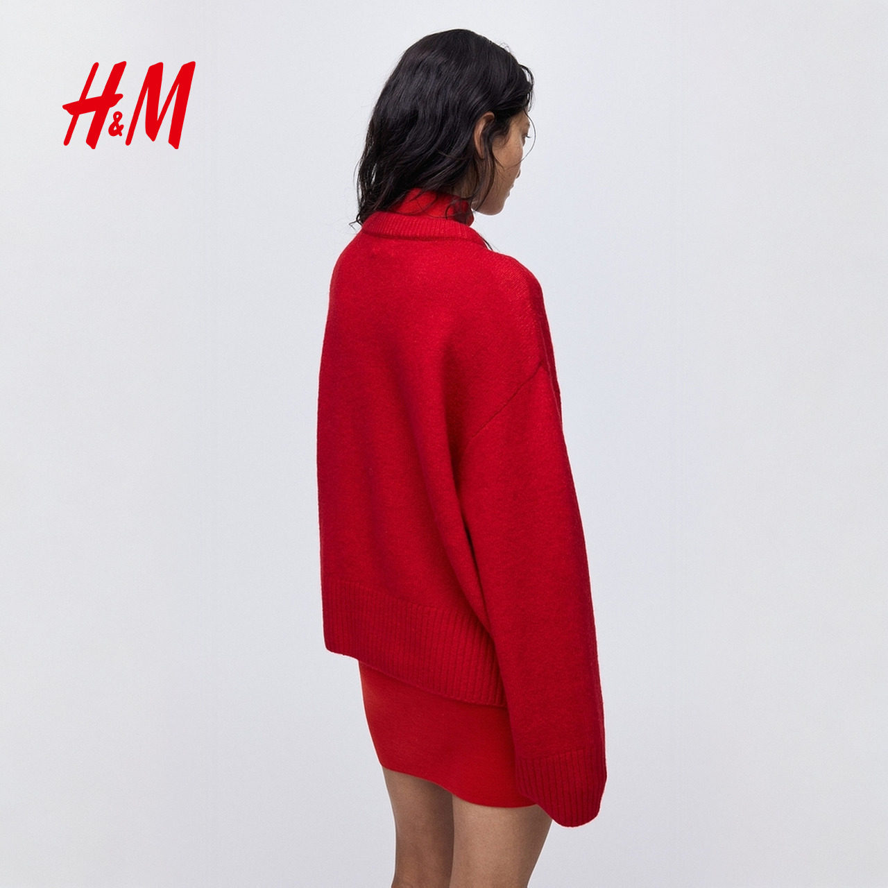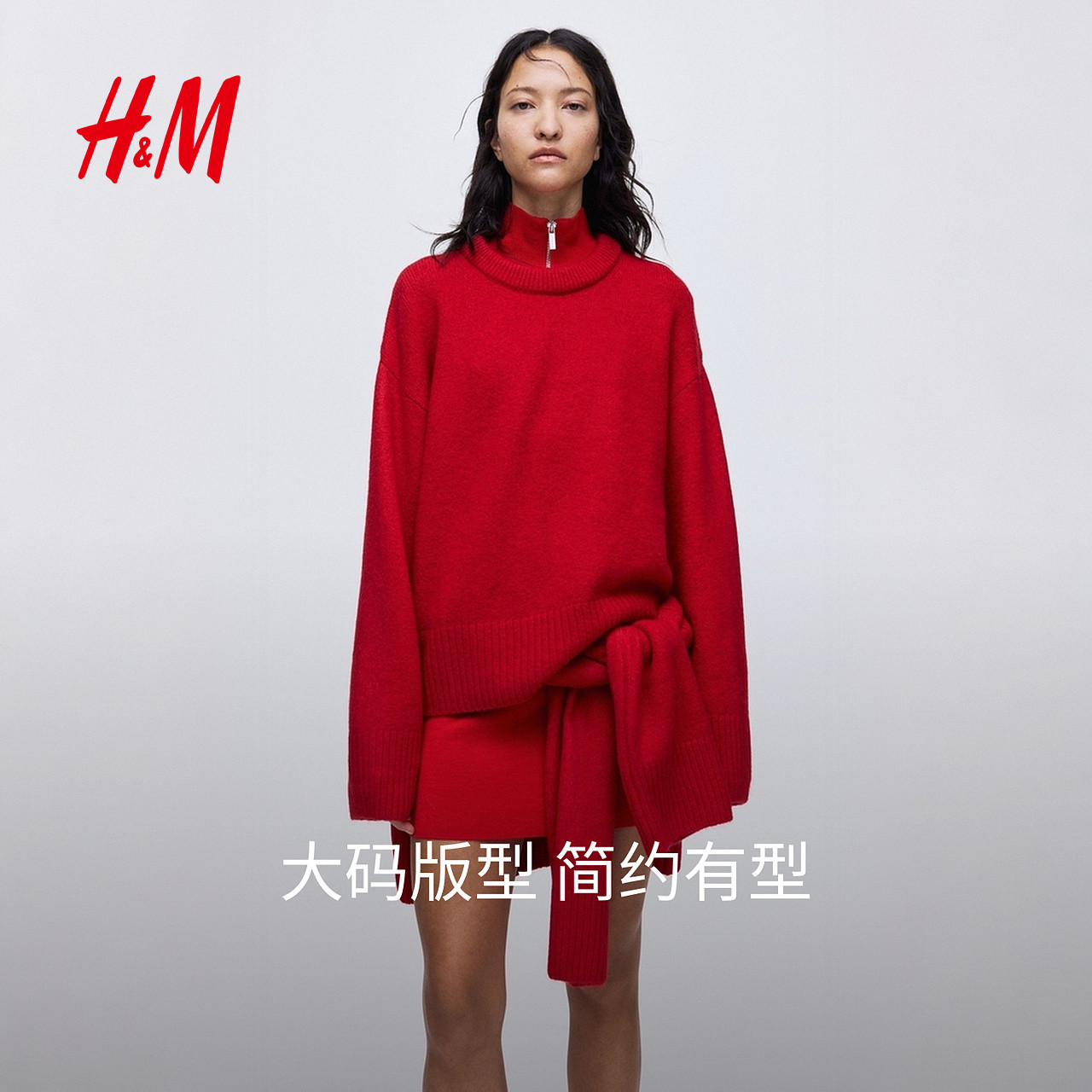 HM女装红色毛针织衫2025冬季新款圆领大廓形新年战袍毛衣1314904