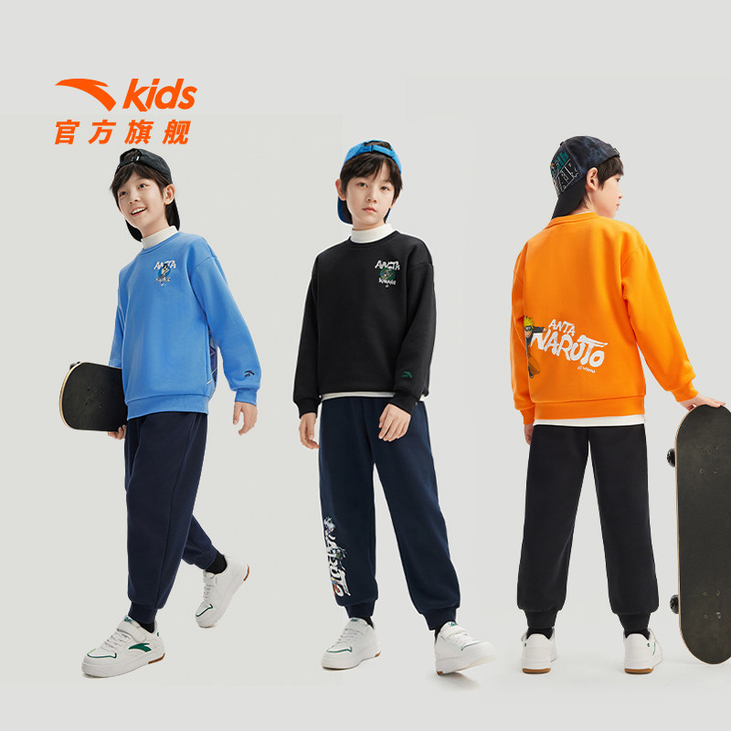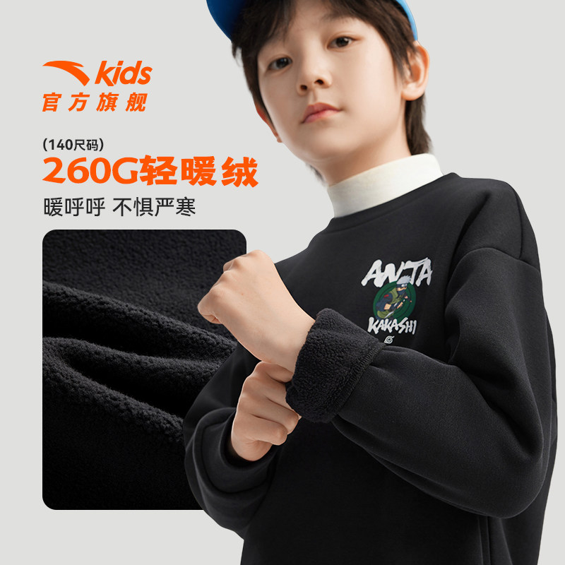 火影忍者IP安踏儿童男童加绒卫衣2025新款大童潮酷黑色套头衫上衣