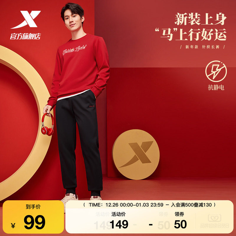 特步新春系列 |加绒卫裤马年长裤冬季男运动裤宽松裤子保暖休闲裤
