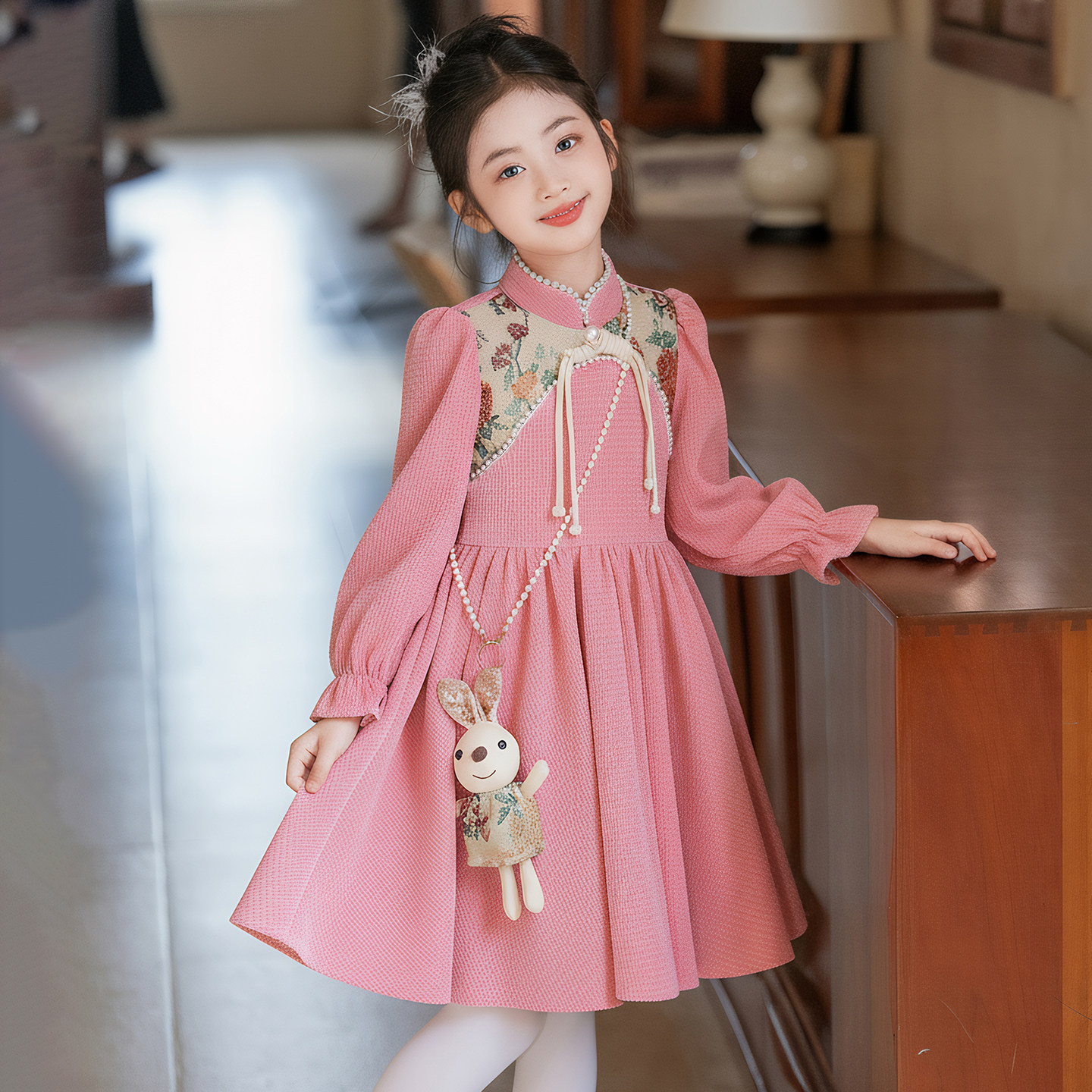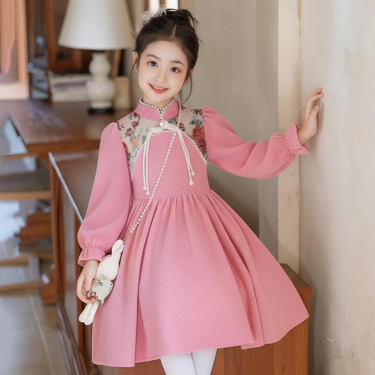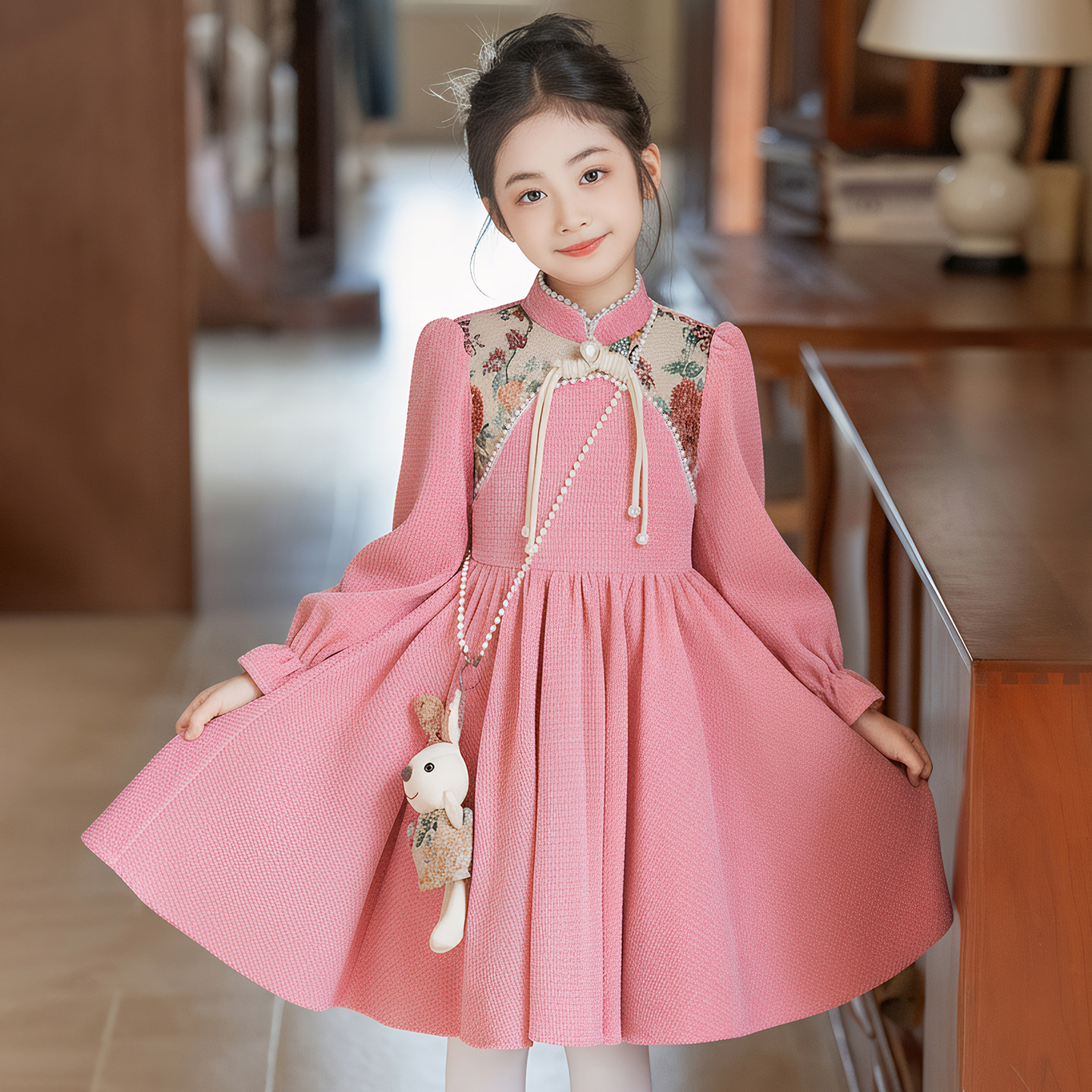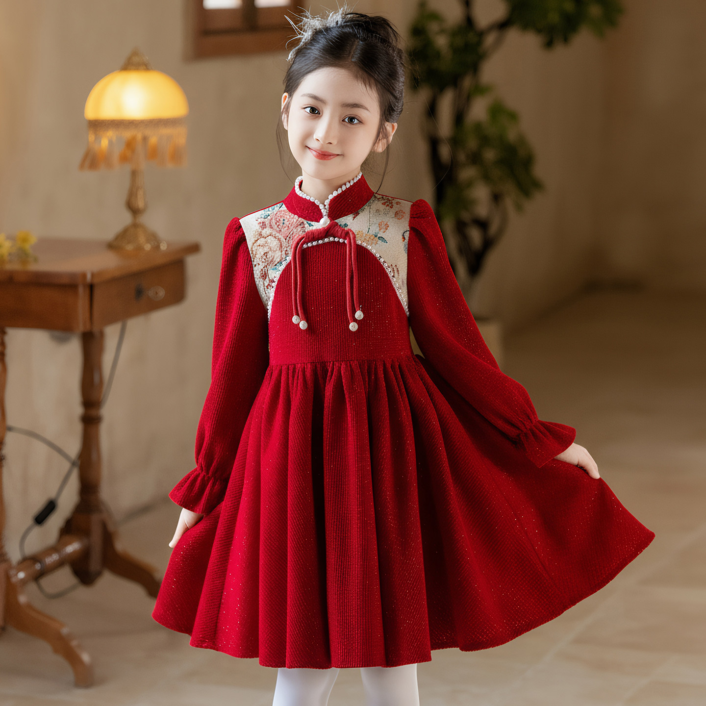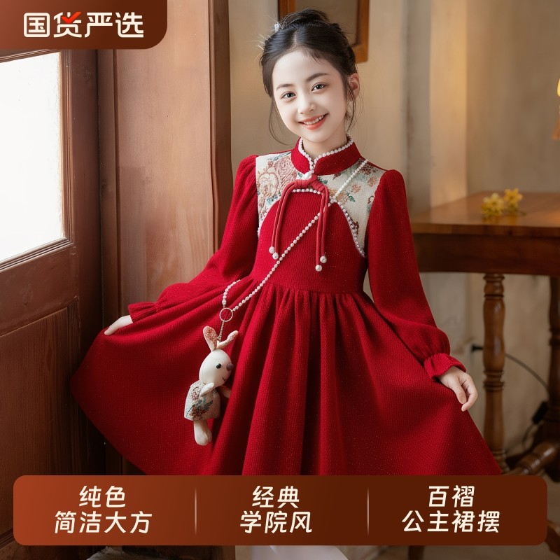 女童连衣裙秋冬新款旗袍儿童洋气公主裙小女孩新中式国风红色裙子