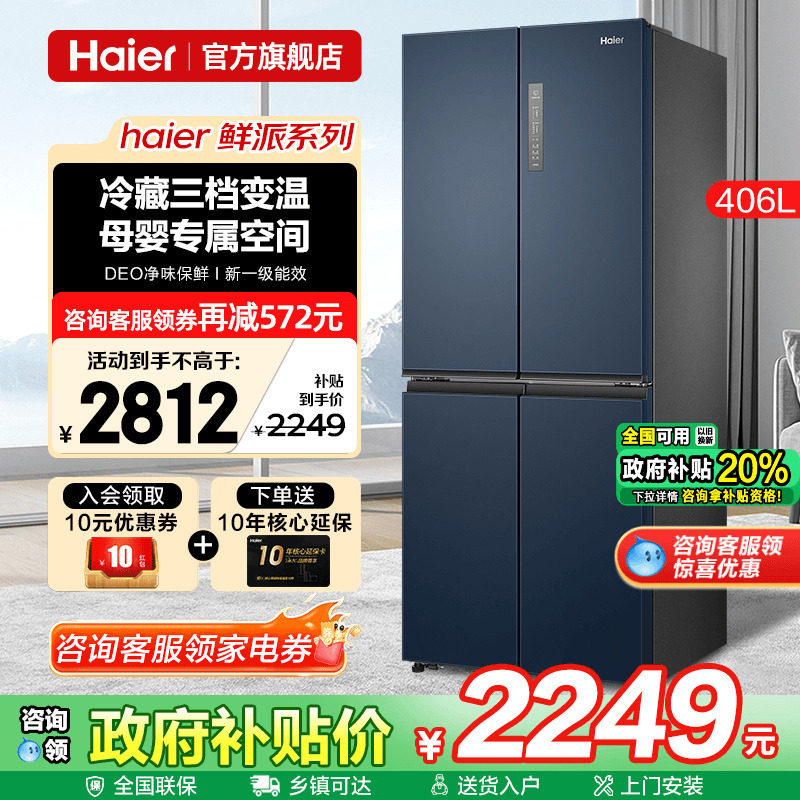 Haier海尔冰箱406L升一级能效家用十字对开四门无霜电冰箱旗舰店