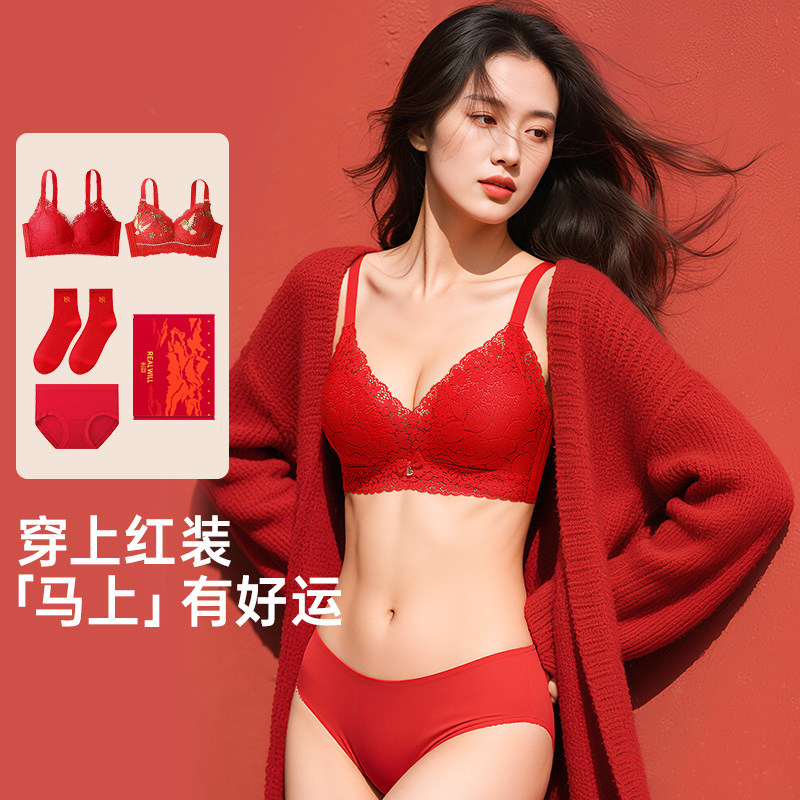 润微茶肌红色内衣女内裤袜子套装大胸聚拢无钢圈本命年结婚文胸