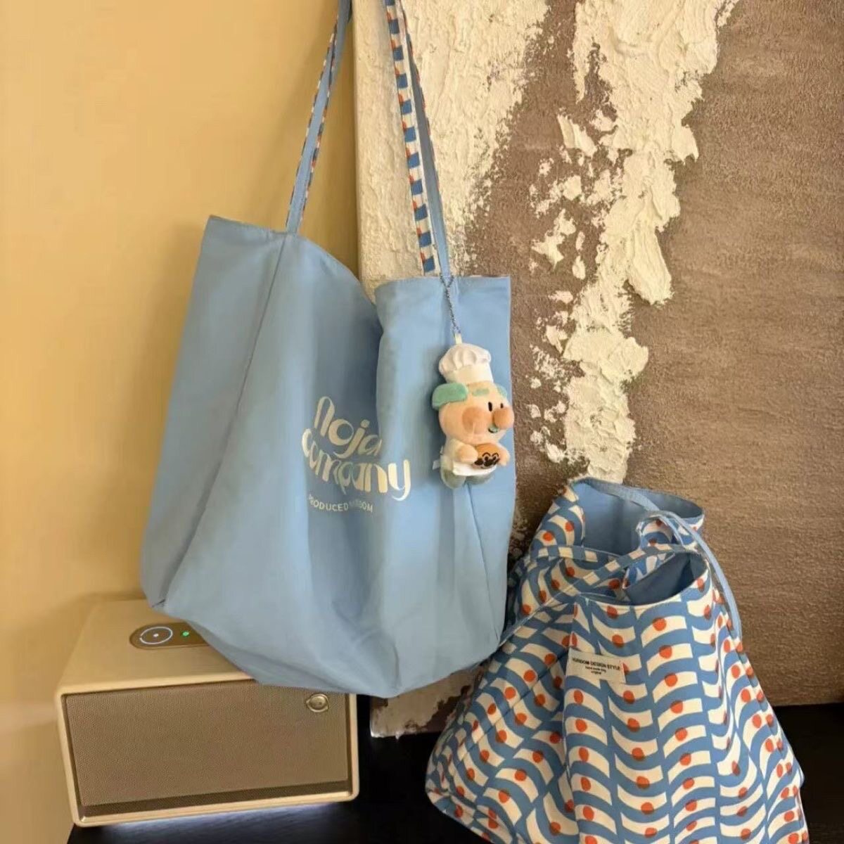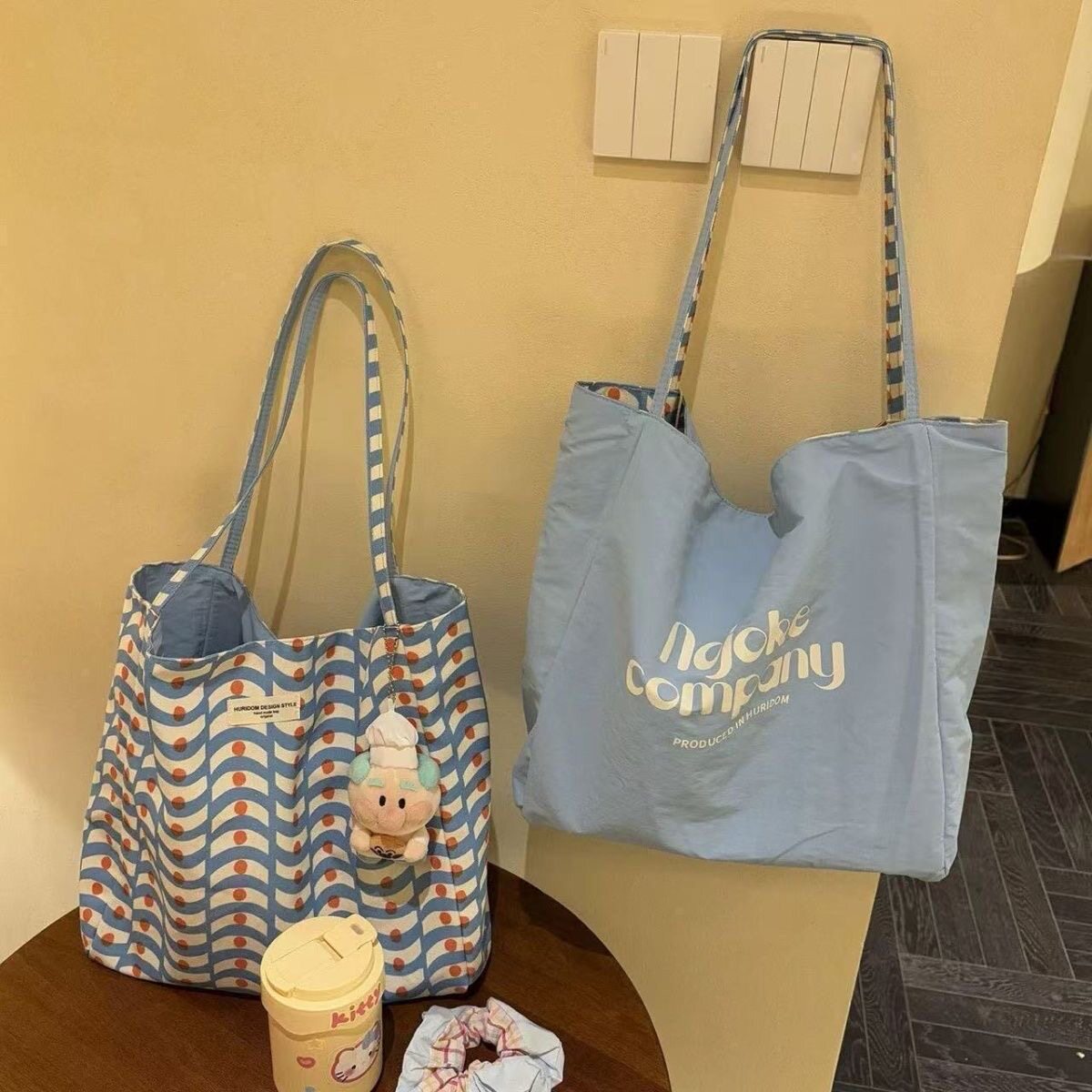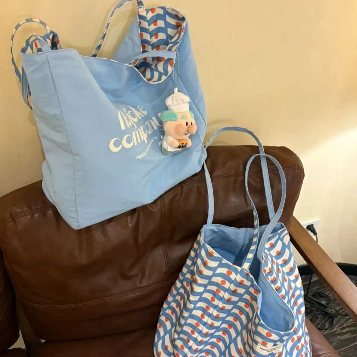 2025慵懒风韩系学生休闲时尚双面大容量购物袋红色帆布蓝色波点