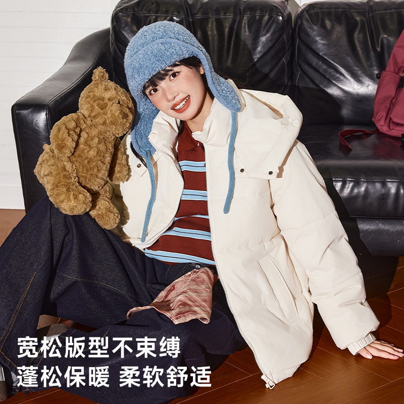 JR真维斯粉色棉袄女冬季爆款甜美浅色系保暖棉服加厚连帽外套