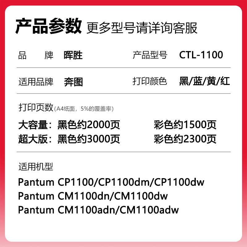 晖胜适用奔图CP1100DW硒鼓CM1100DN粉盒CTL-1100 CM1100ADN CM1100ADW打印机耗材碳粉彩色墨盒CTL-1100X墨粉