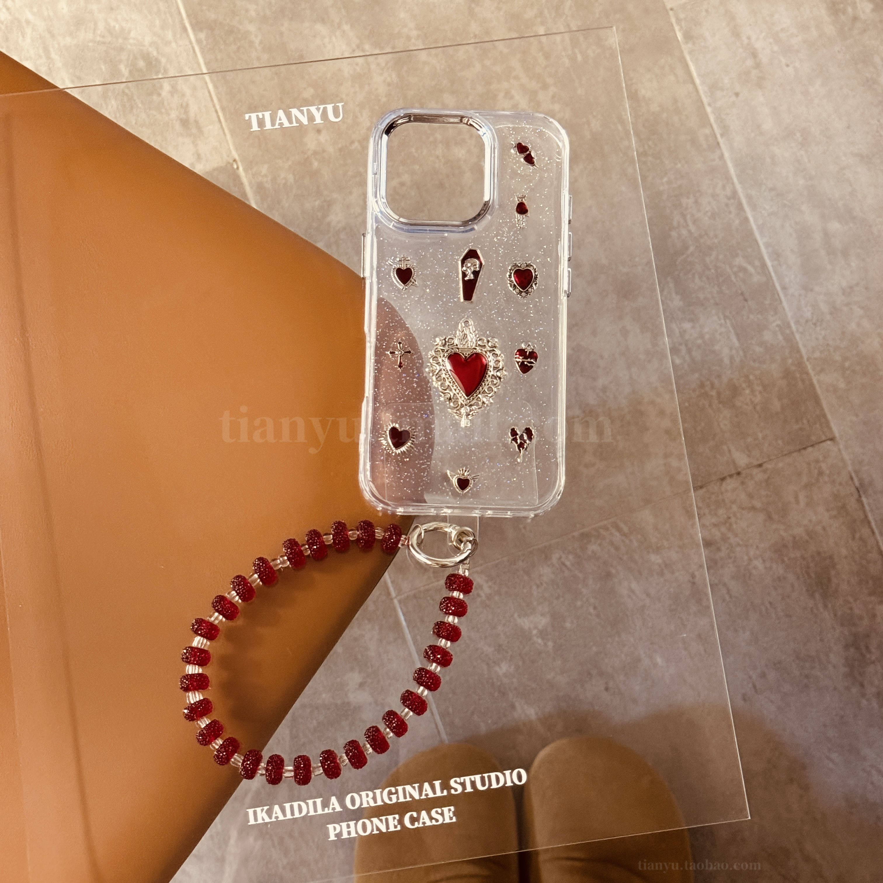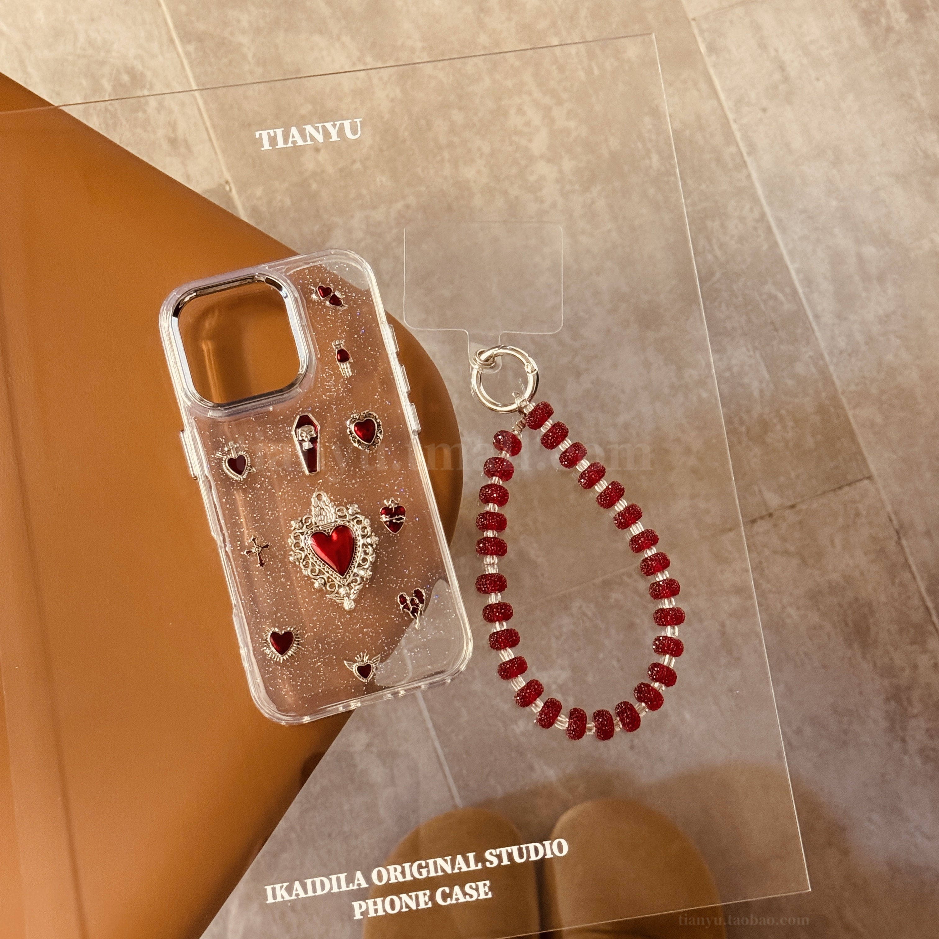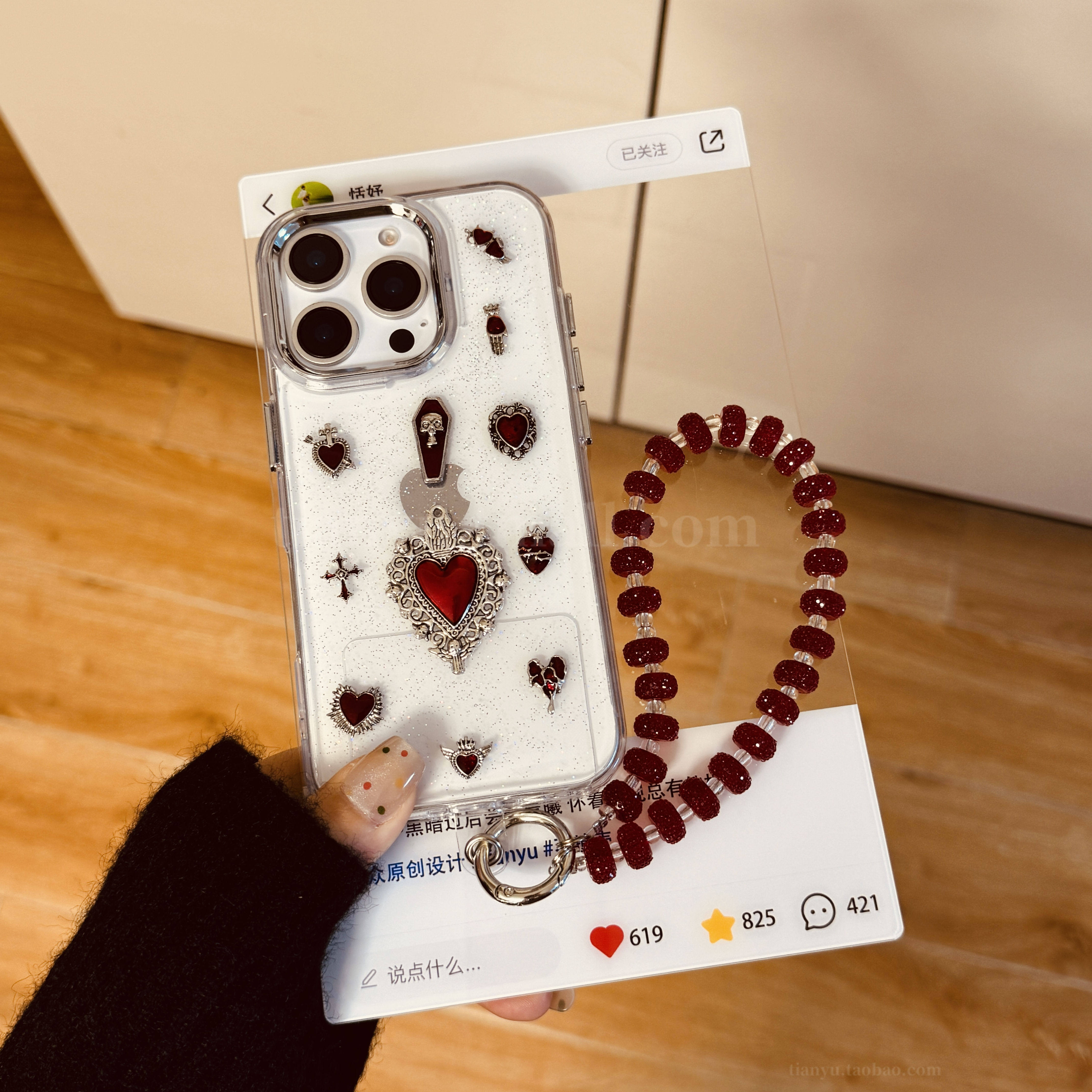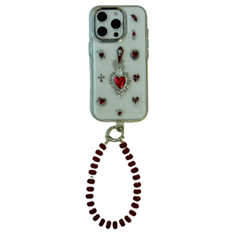 恬妤 高贵奢华立体酒红色爱心适用于iphone16pro手机壳苹果14透明13promax带手链条11小众15plus可手拎12pro