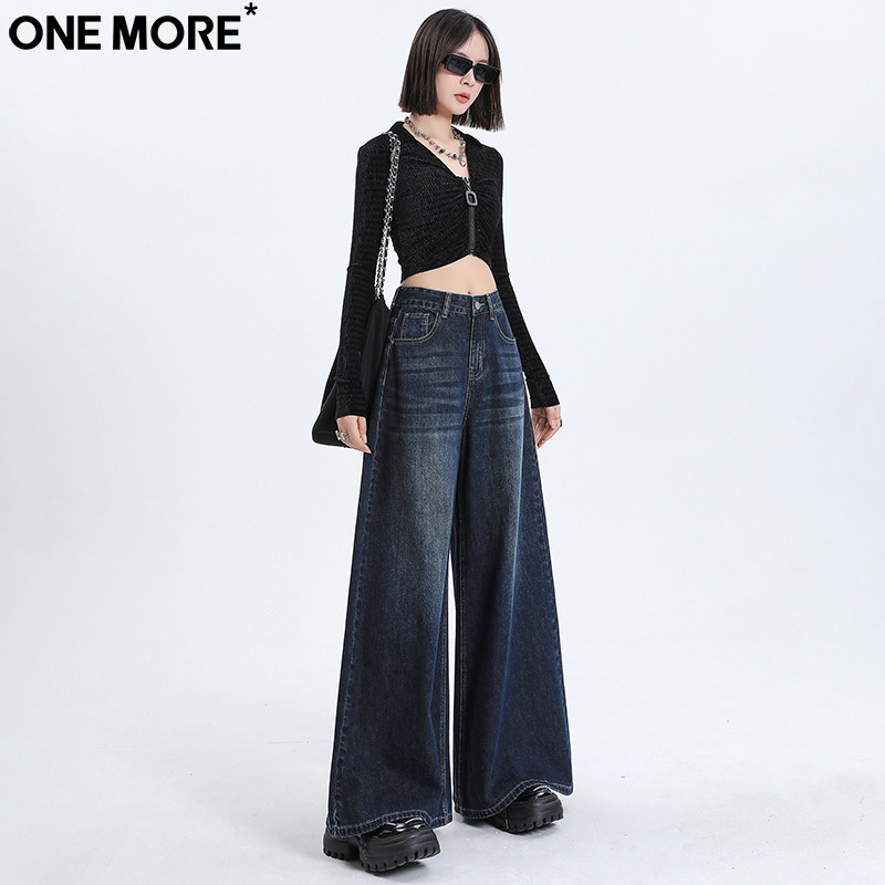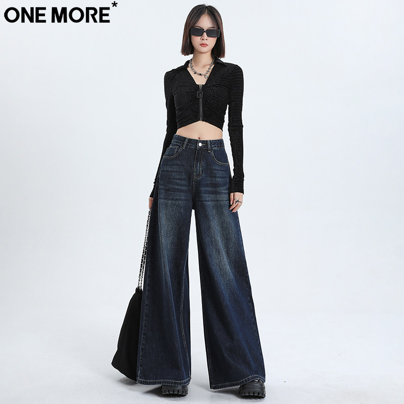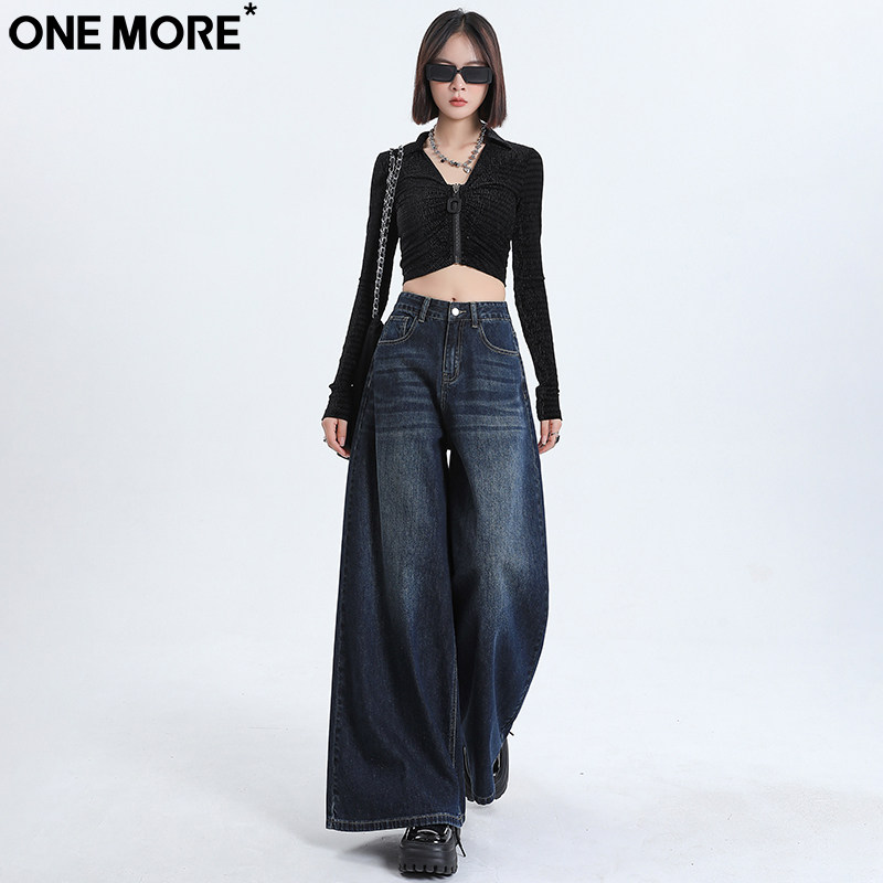 One More港风高腰阔腿牛仔裤女秋季新款宽松直筒显瘦垂感拖地裤女