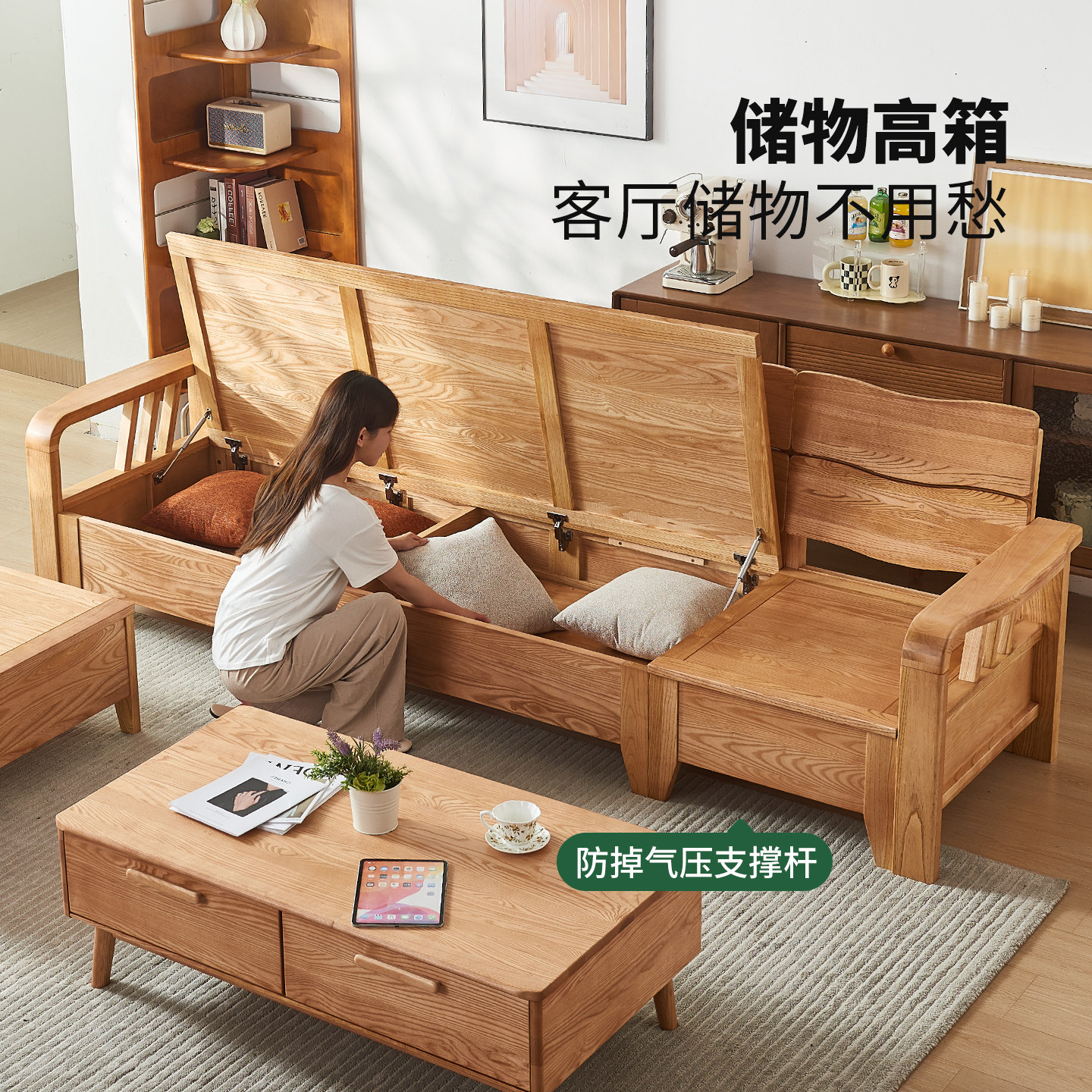优尚雅轩日式原木风实木沙发客厅直排沙发白蜡木可拆洗布艺沙发