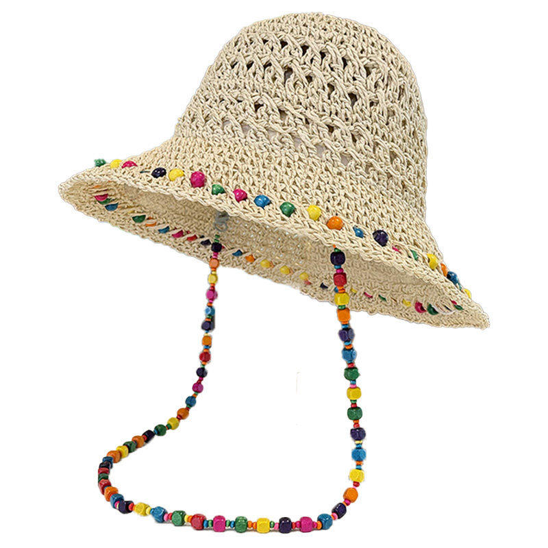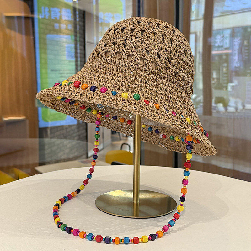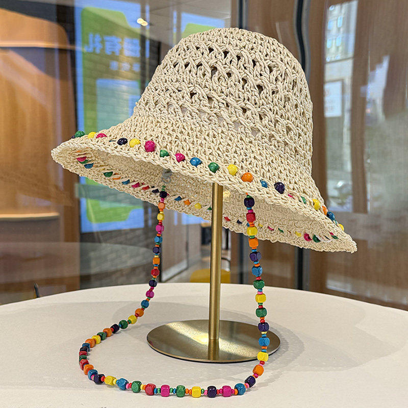 泫雅风彩色木珠草帽女夏季大帽檐草编渔夫帽可折叠海边遮阳防晒帽