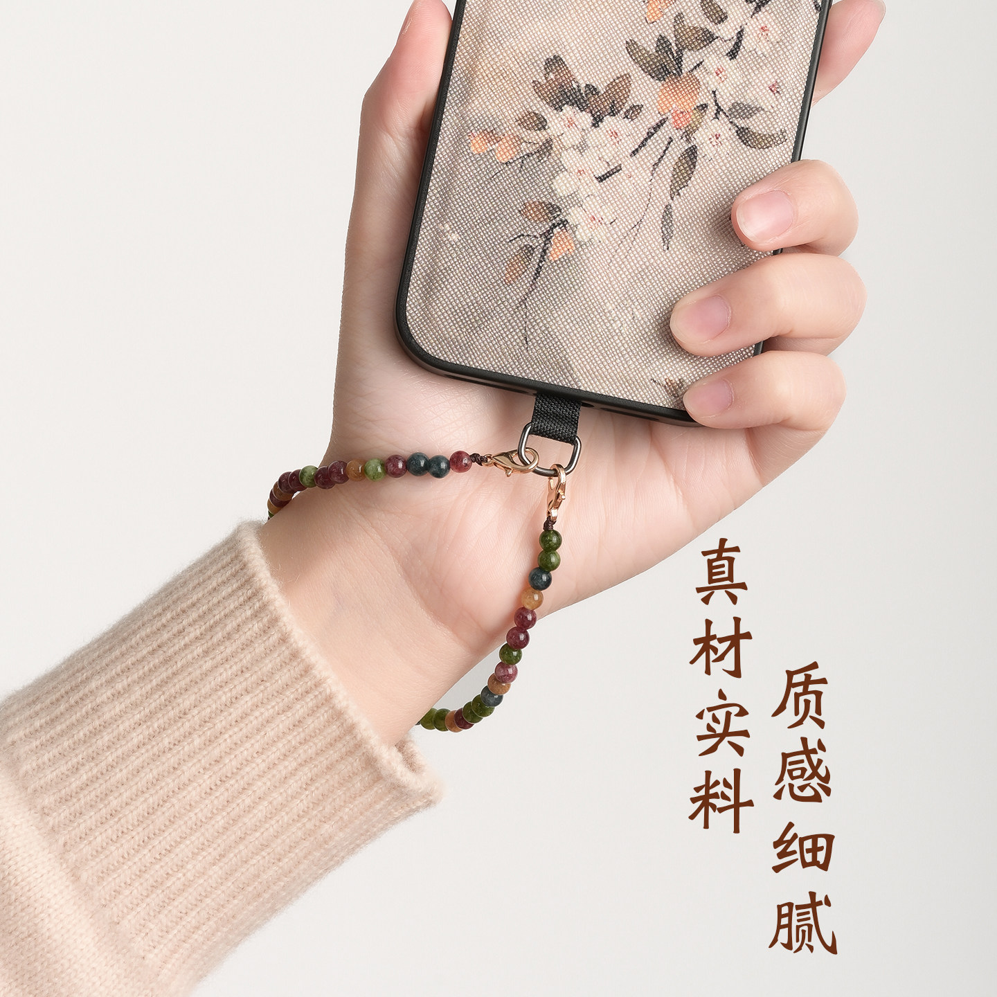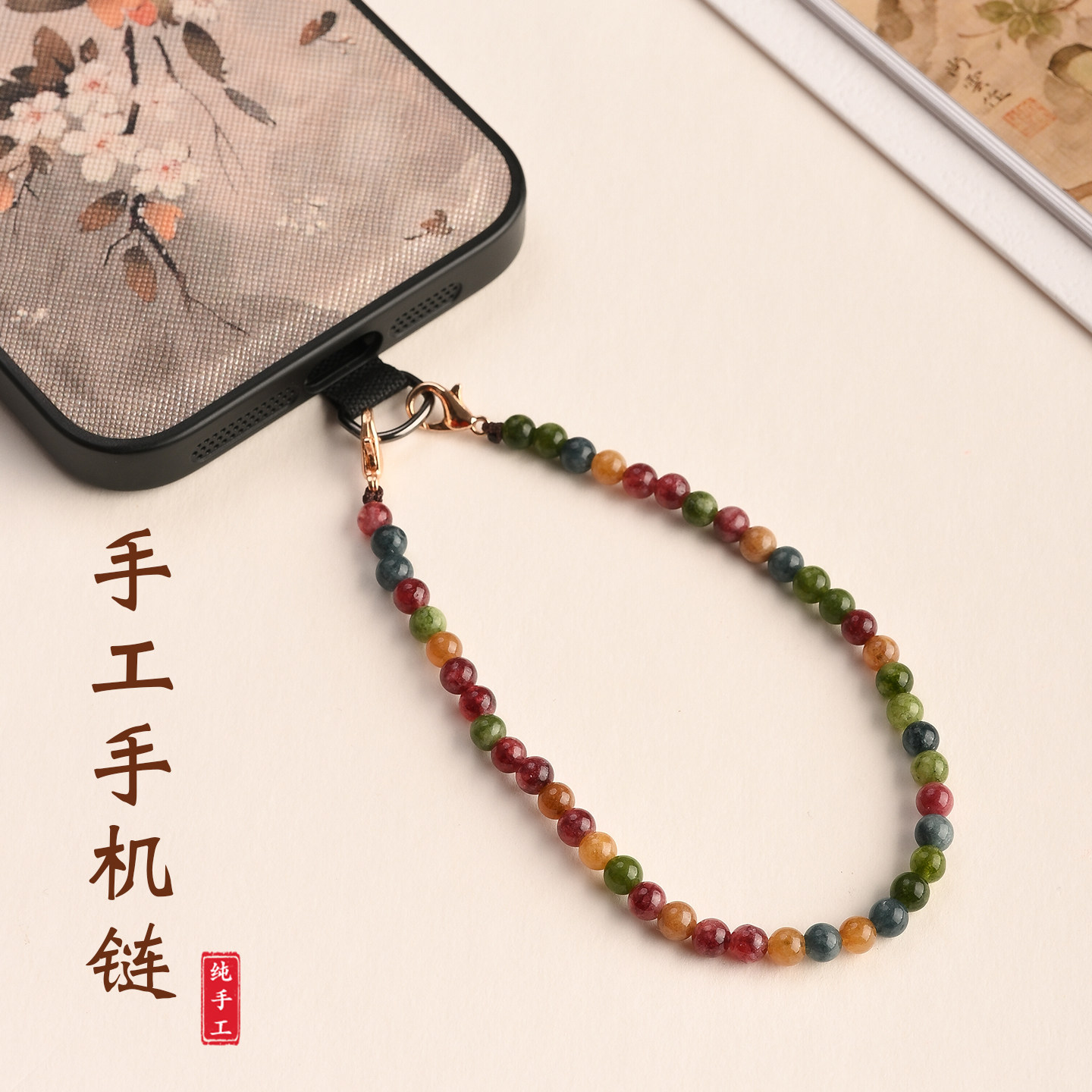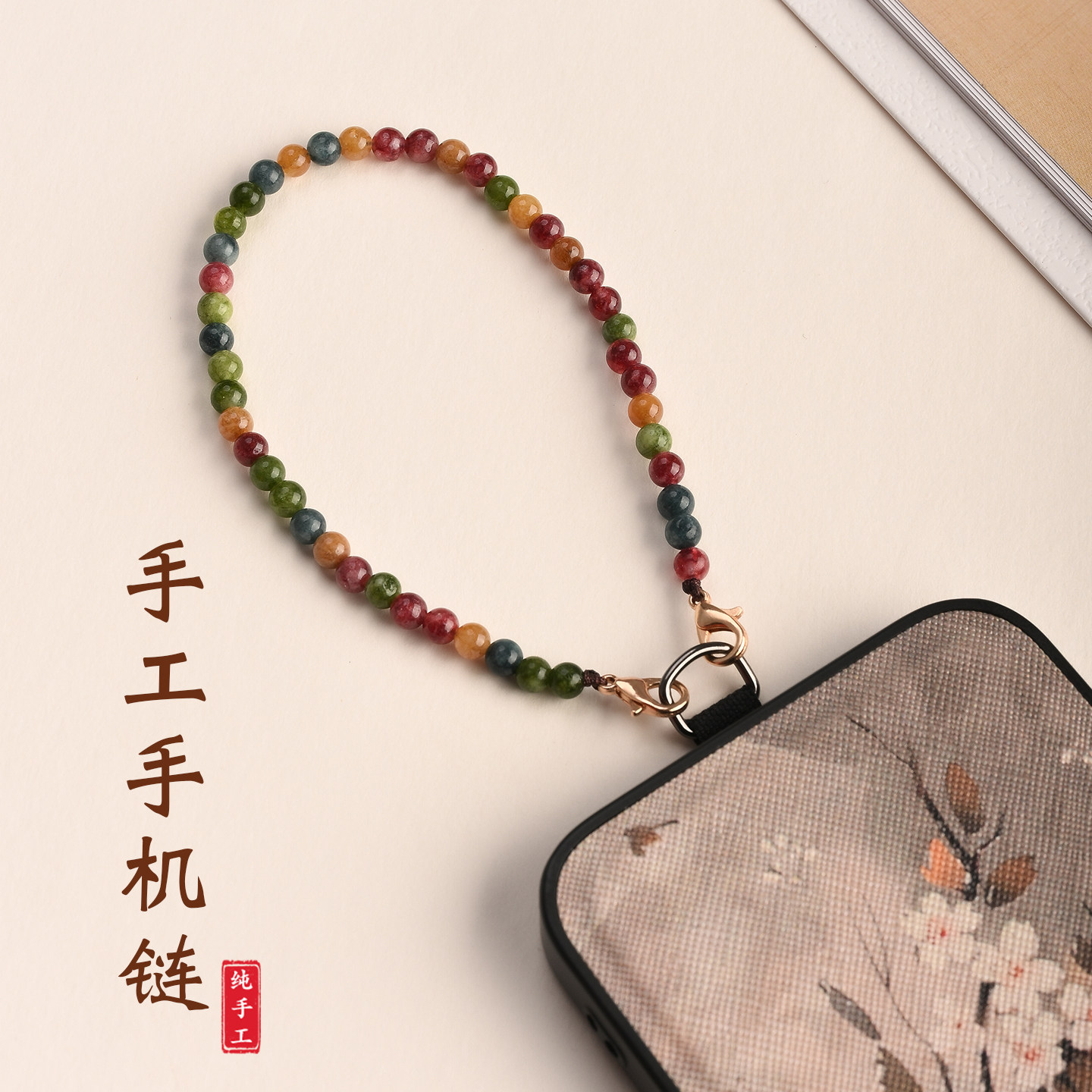 彩色碧玺玉髓手机链手工串珠简约百搭夹片款手机防丢挂件挂饰2026