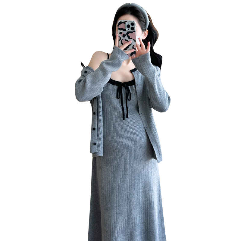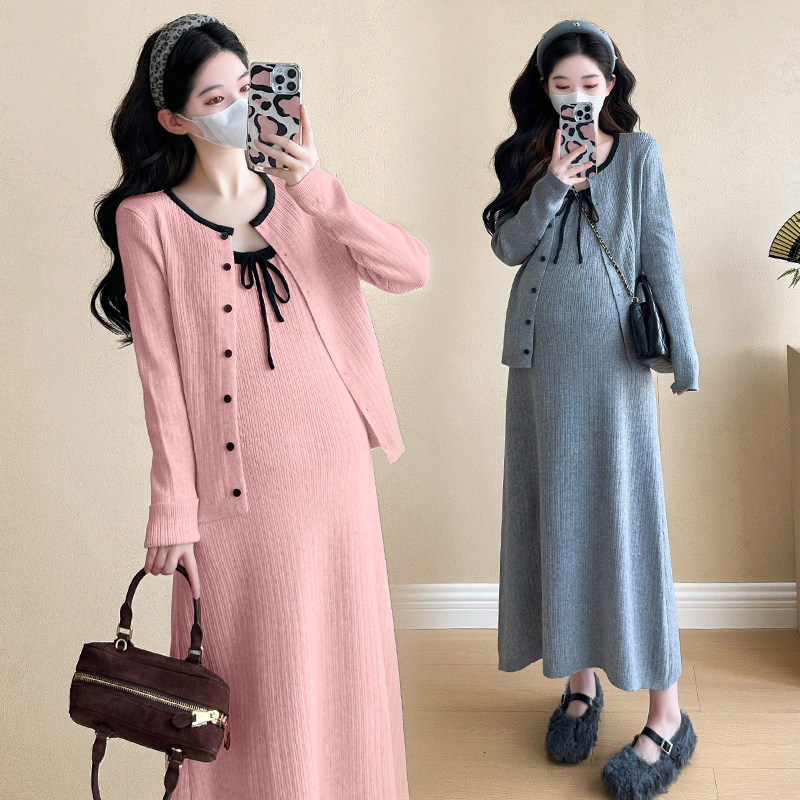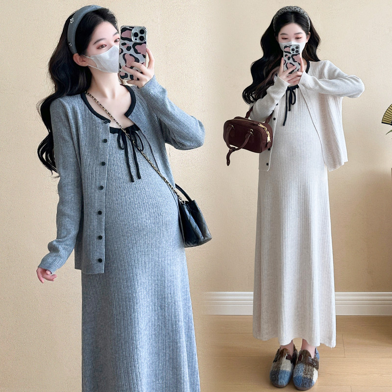 婧麒孕妇连衣裙春秋高级感2026新款条纹长袖吊带裙宽松套装两件套