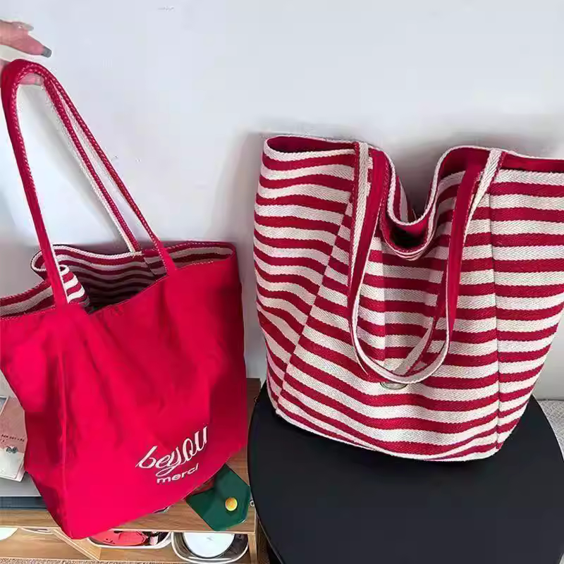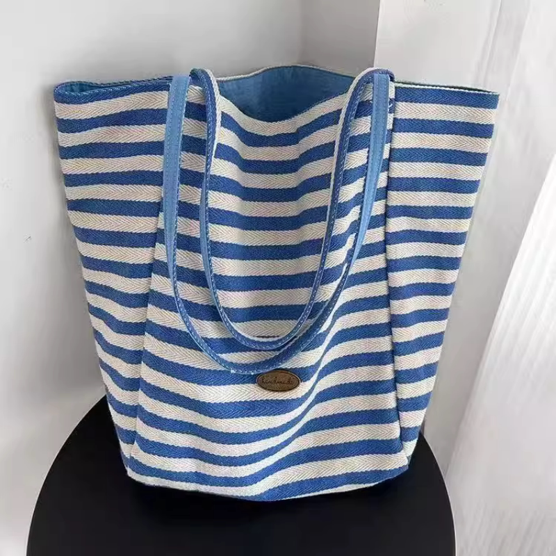 2025夏条纹帆布袋 韩国ins慵懒风托特包学生大容量休闲单肩包包女
