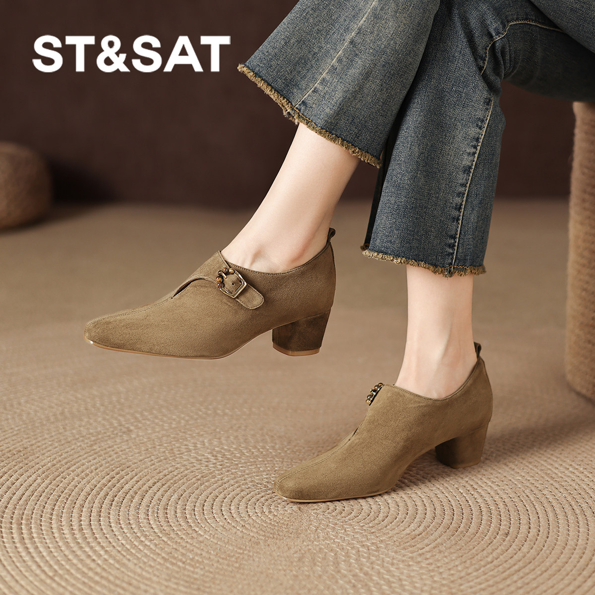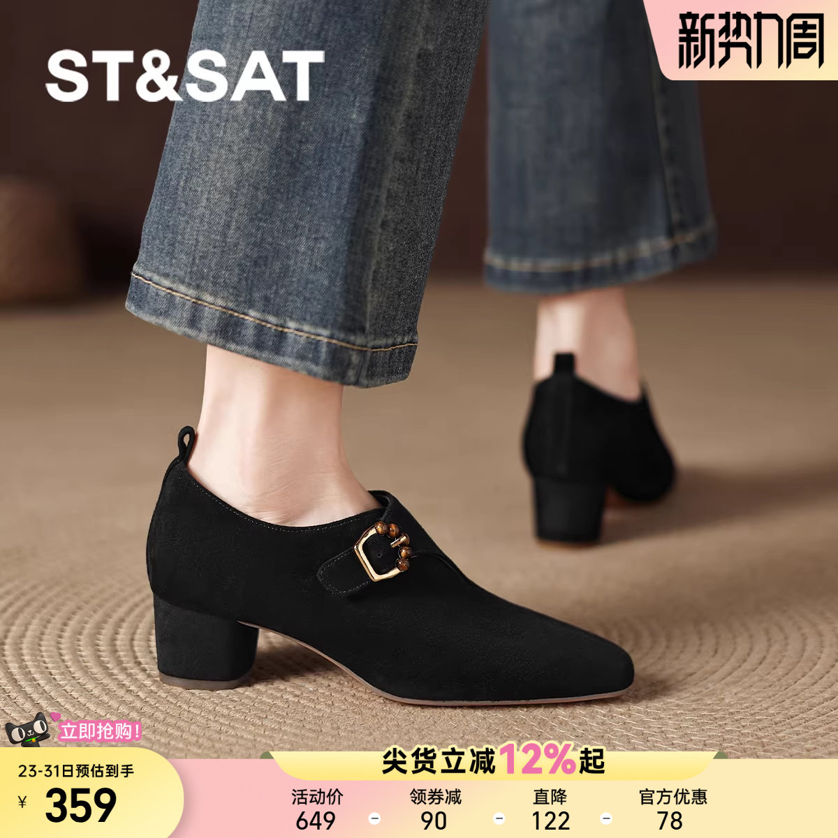 星期六羊皮短靴女款新款秋冬法式粗跟踝靴女士深口单鞋妈妈鞋