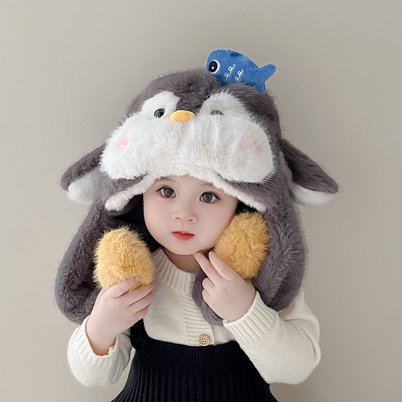 宝宝儿童企鹅帽子冬季会动的毛绒加厚男女童婴儿一体护耳保暖秋冬