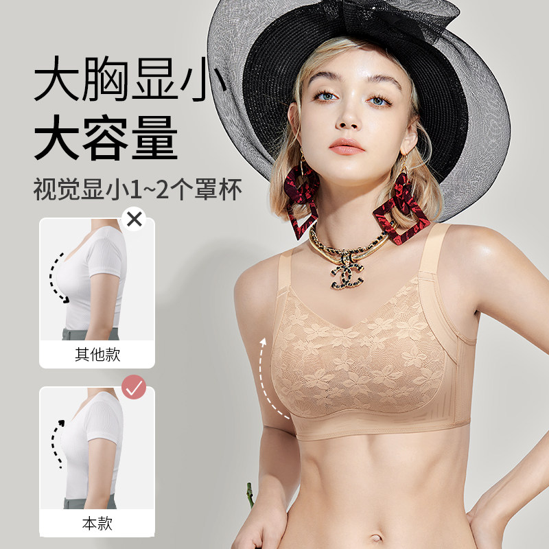 润微茶肌内衣女士大胸显小薄款收副乳聚拢大码上托防下垂蕾丝文胸