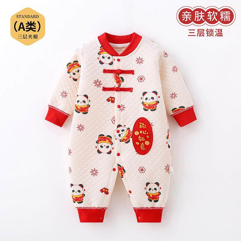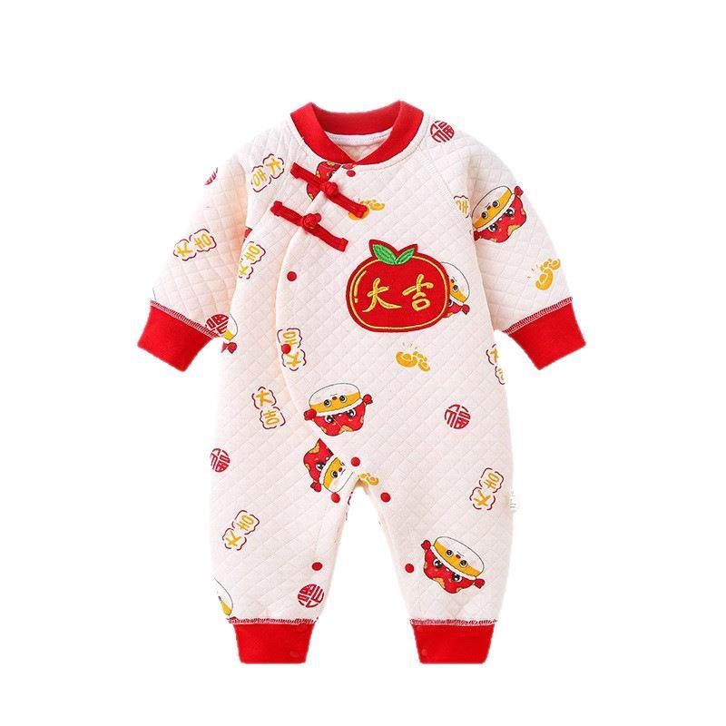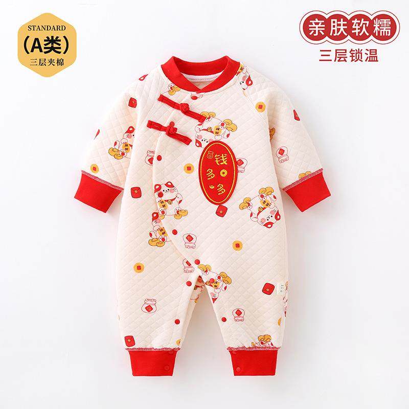 新生婴儿过年拜年服满月百天宝宝周岁礼服红色连体衣加厚夹棉秋冬