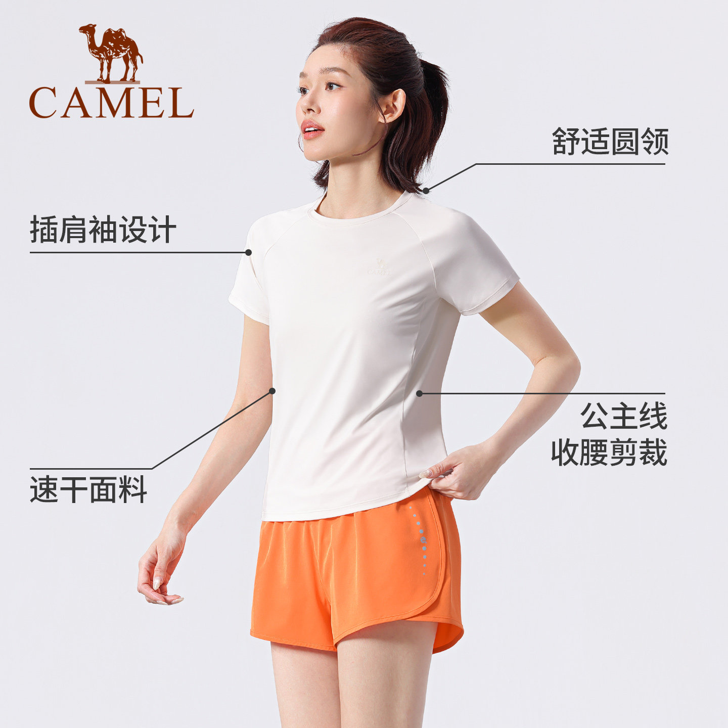骆驼瑜伽T恤女款春季速干透气修身显瘦运动服时尚训练健身短袖衫