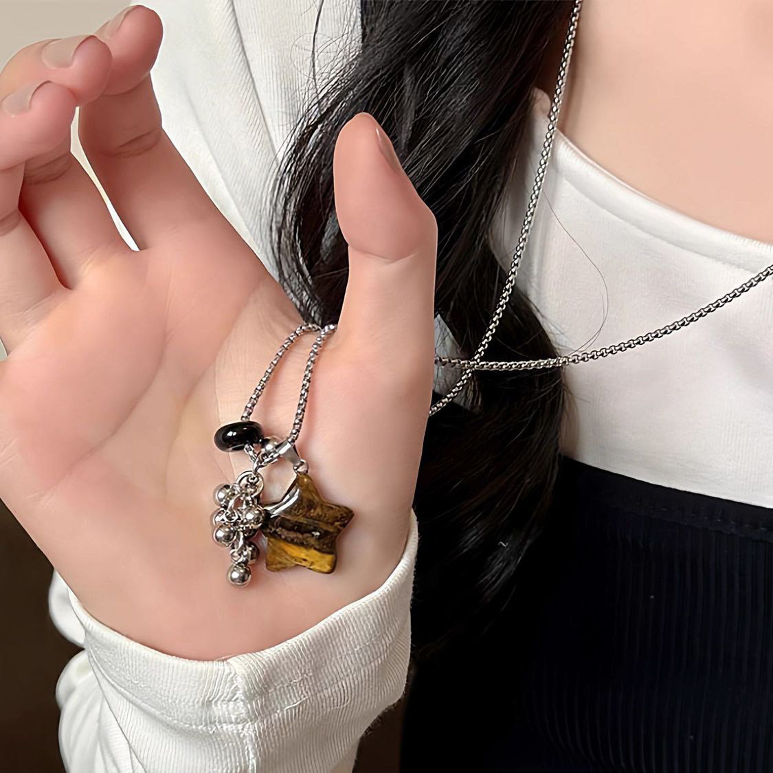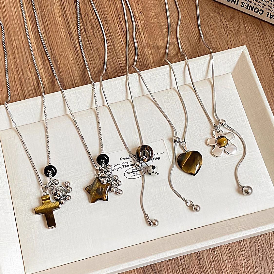 虎眼石爱心项链女高级感小众长款毛衣链百搭复古配饰十字架花朵