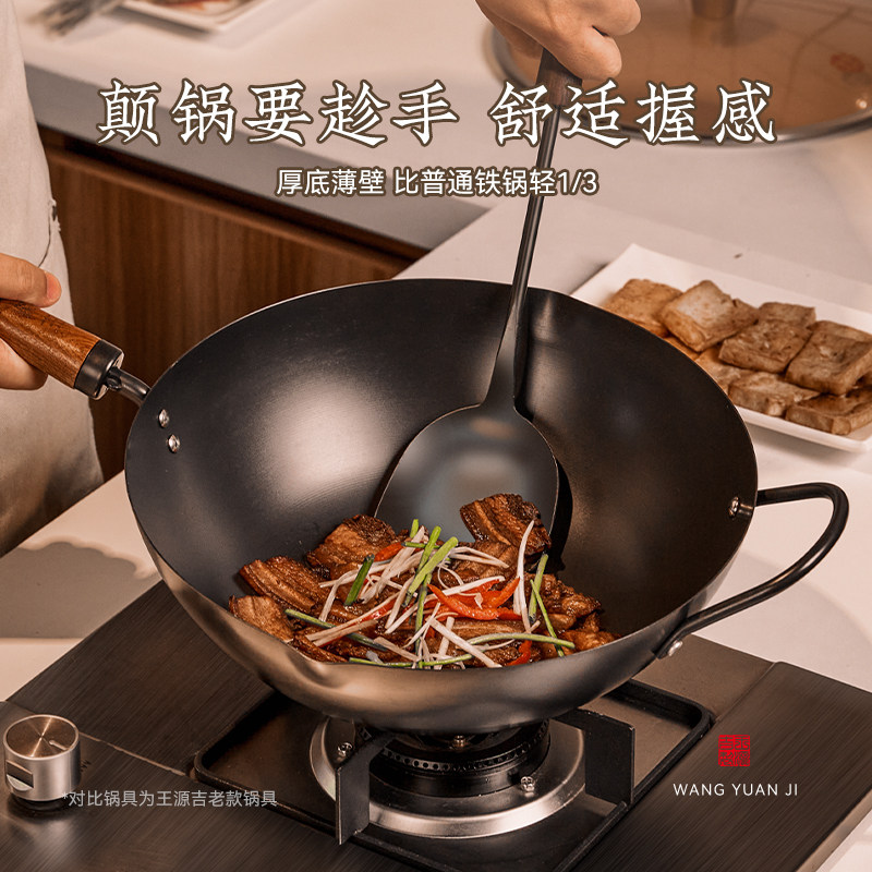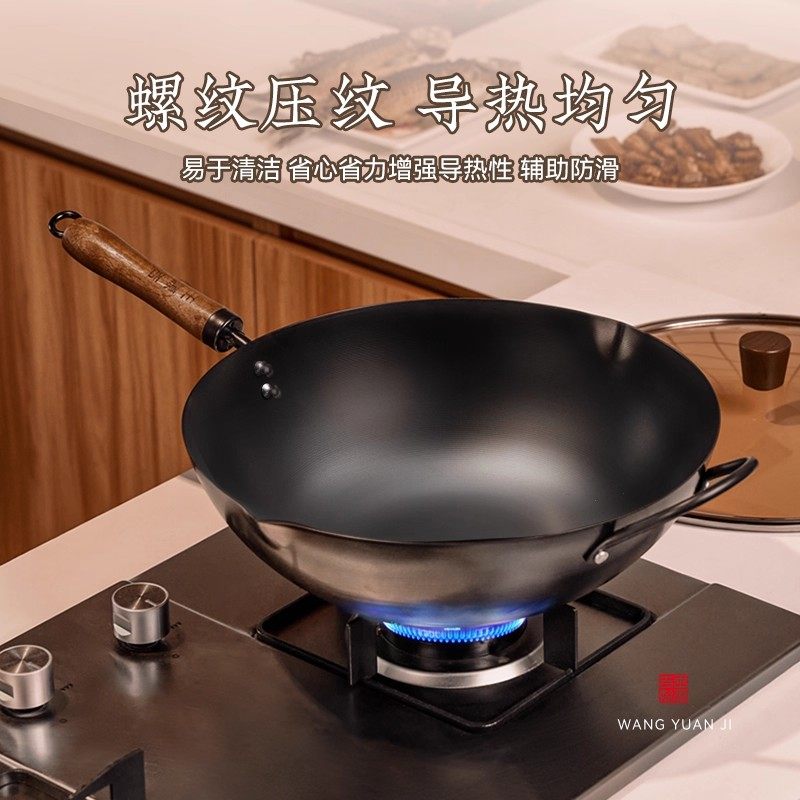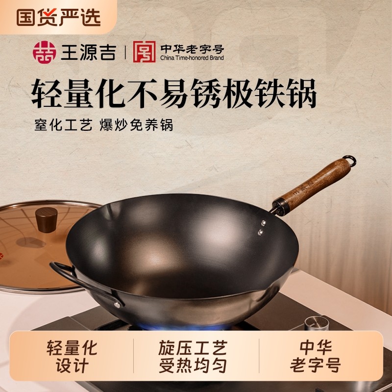王源吉铁锅无涂层炒锅家用精铸铁燃气煤气灶适用老式不粘炒菜锅