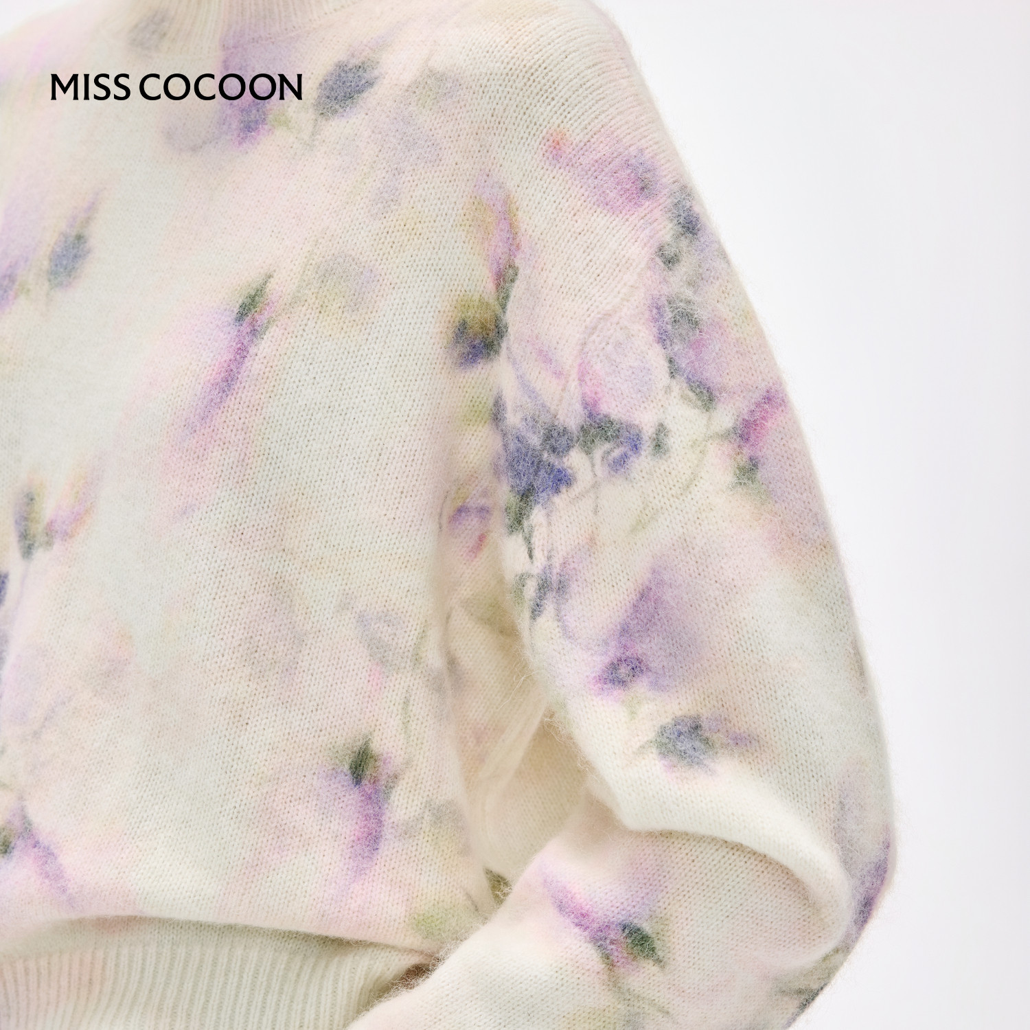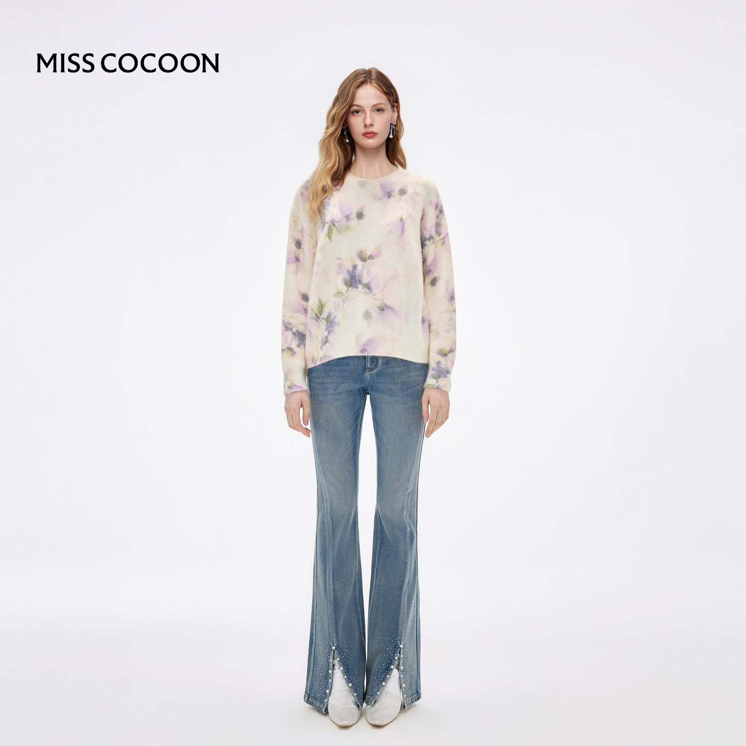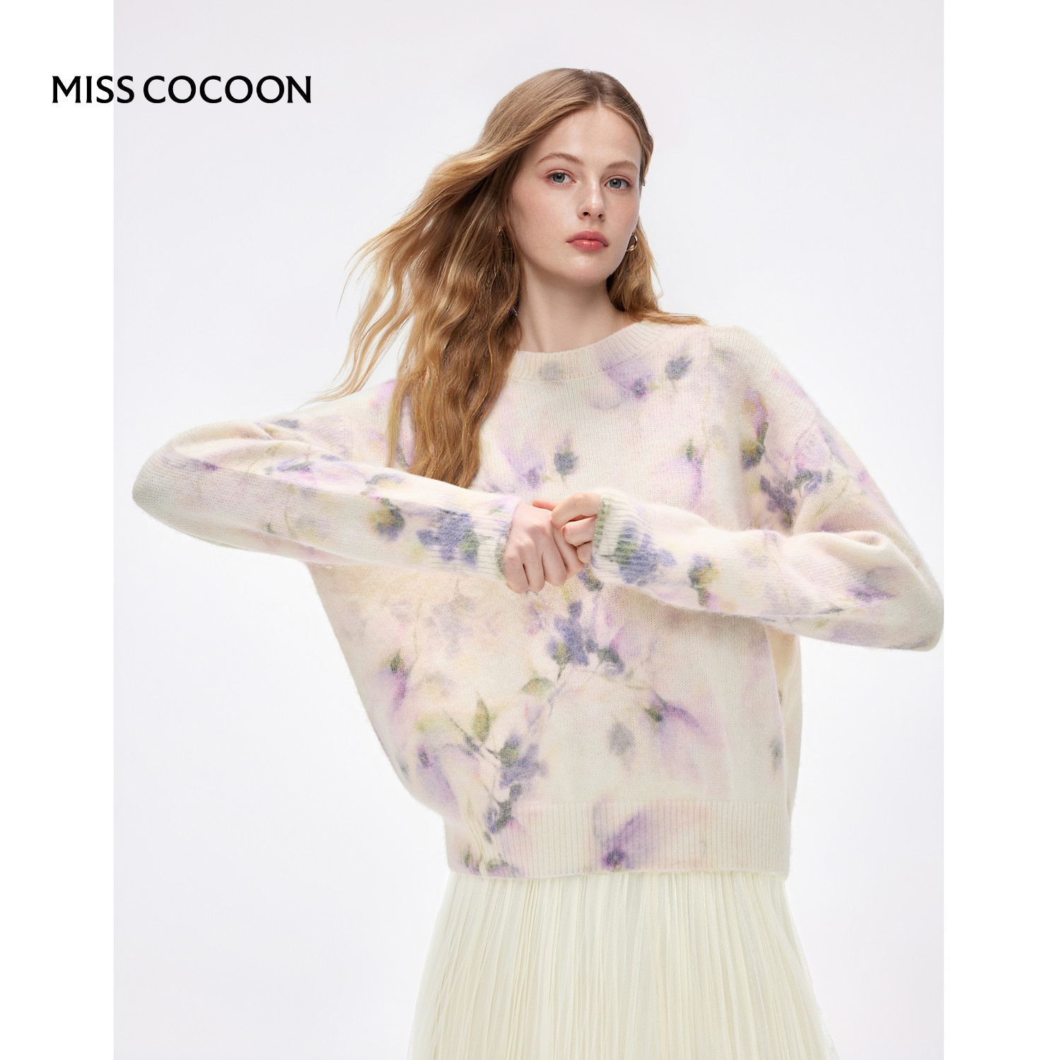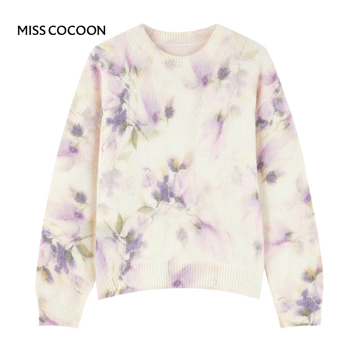 MISSCOCOON可可尼圆领印花毛衣女2025冬季新款紫色花朵长袖针织衫