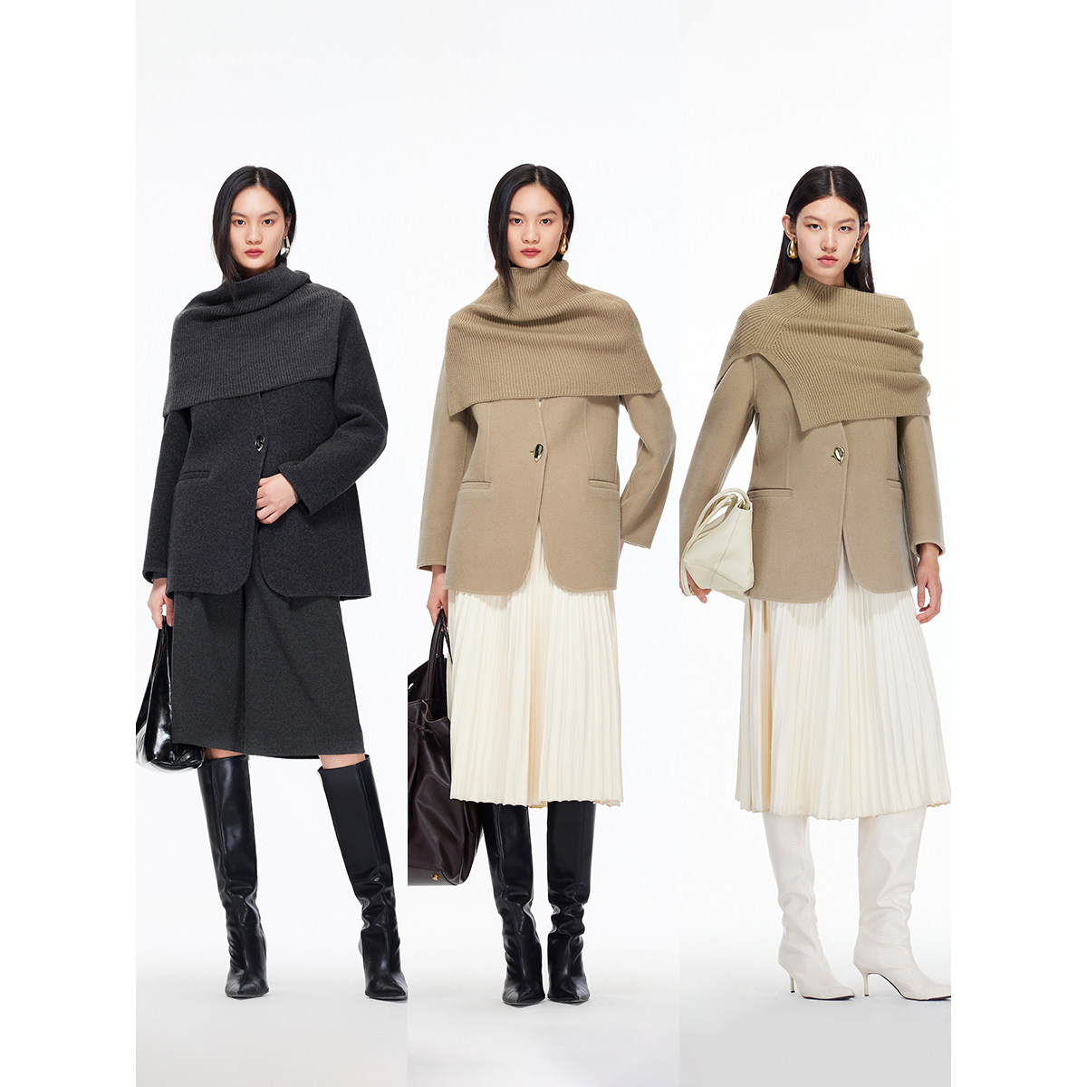 围脖设计增加造型,层次垫肩设计优化头肩比