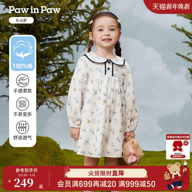 PawinPaw卡通小熊童装25年秋季新款女宝宝A字版纯棉小碎花连衣裙