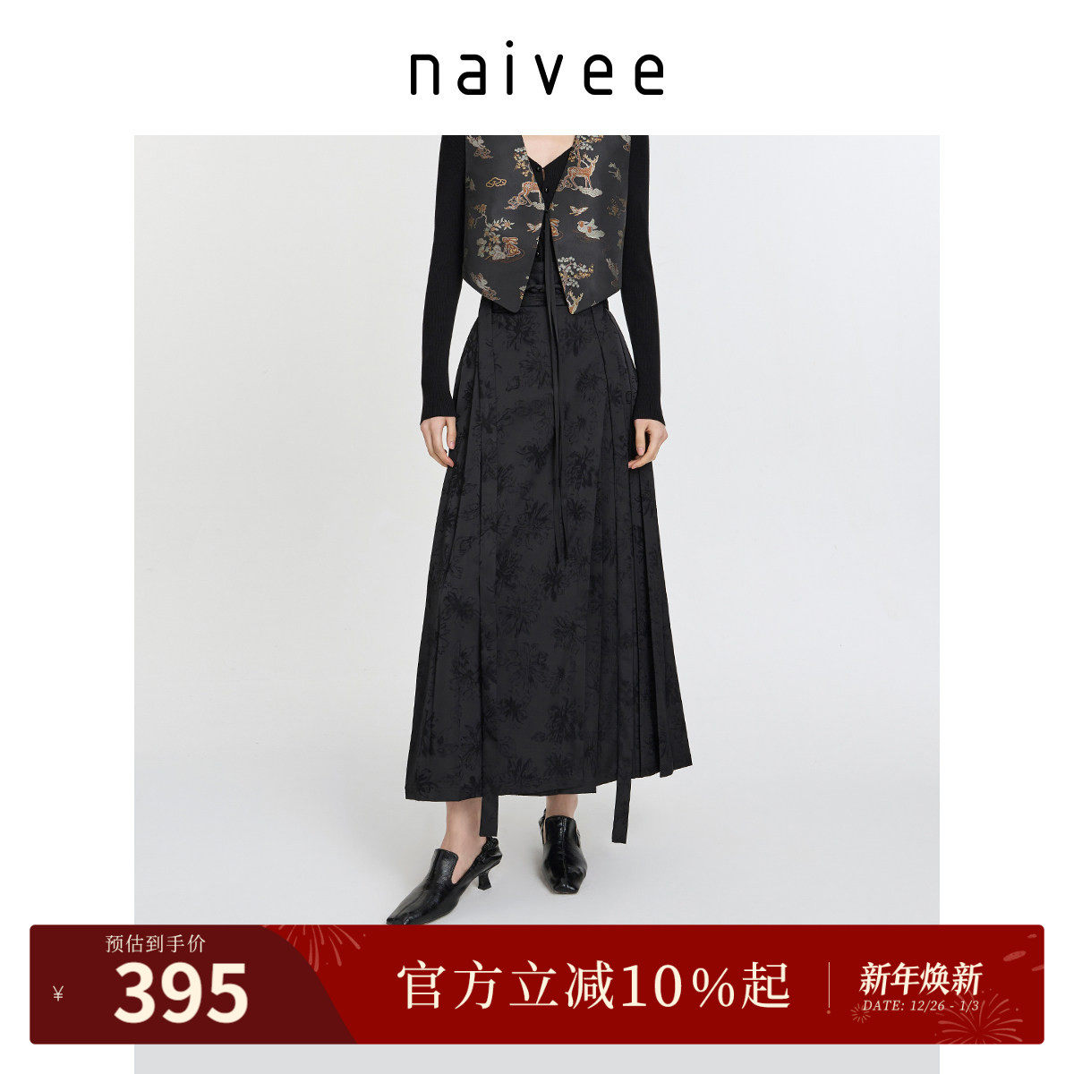 纳薇喜愿系列新中式女装改良国风提花黑色马面裙直筒半身裙秋款