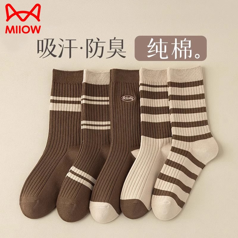 猫人美拉德堆堆袜子女士秋冬季100%纯棉吸汗中筒防臭透气诸暨长袜
