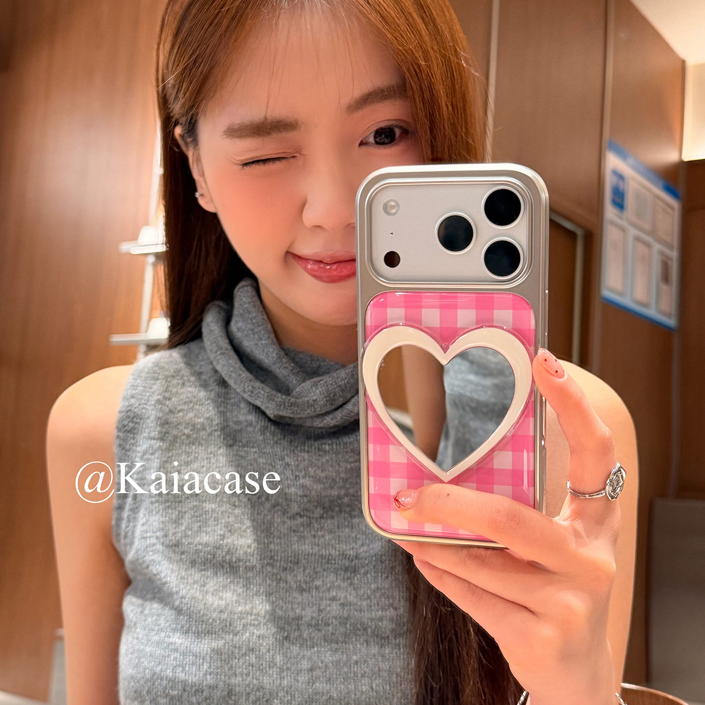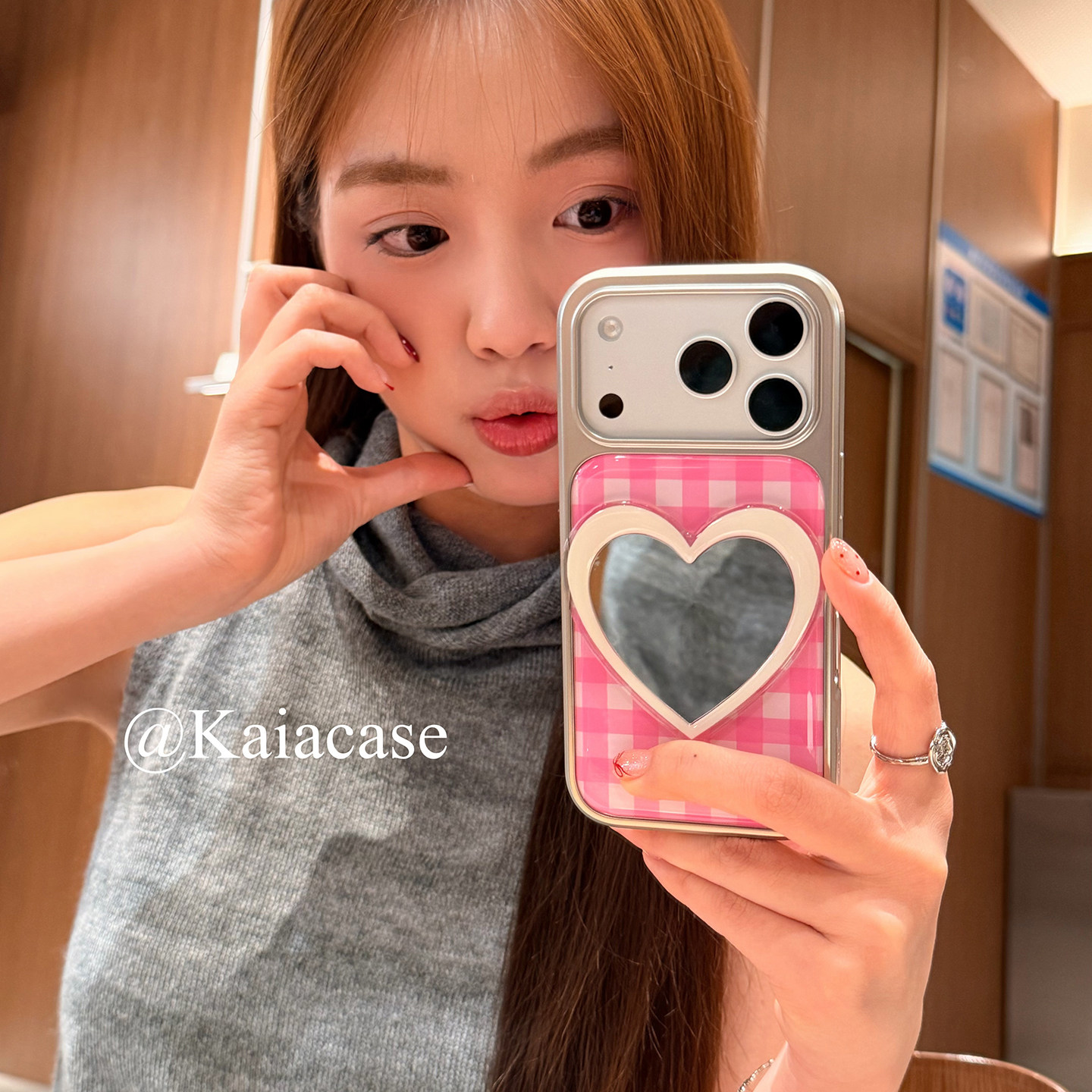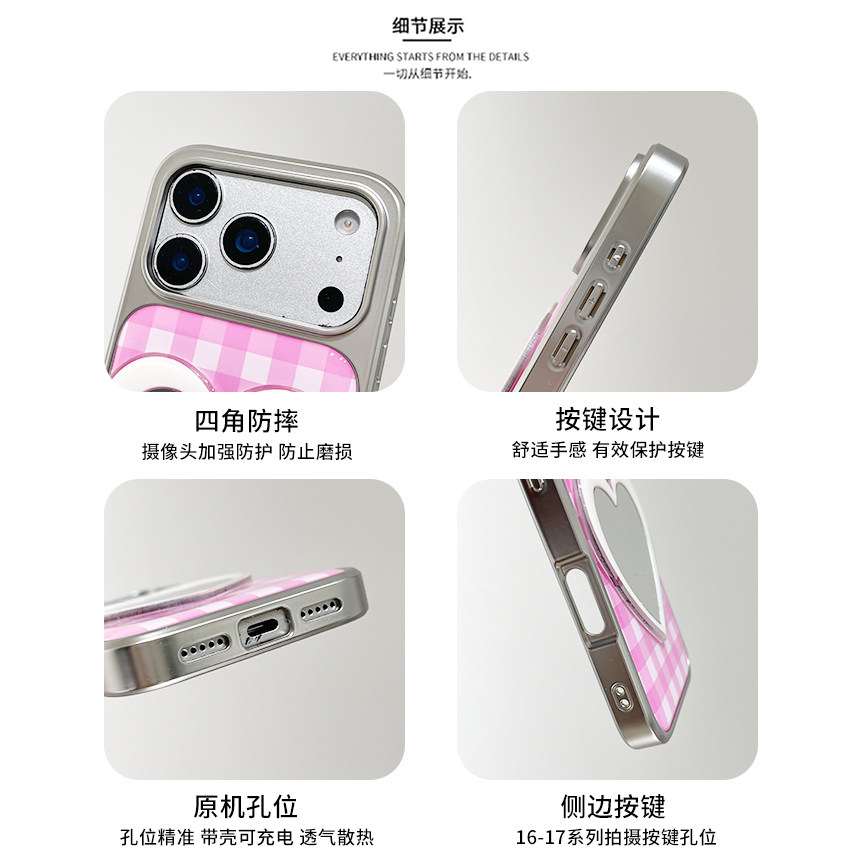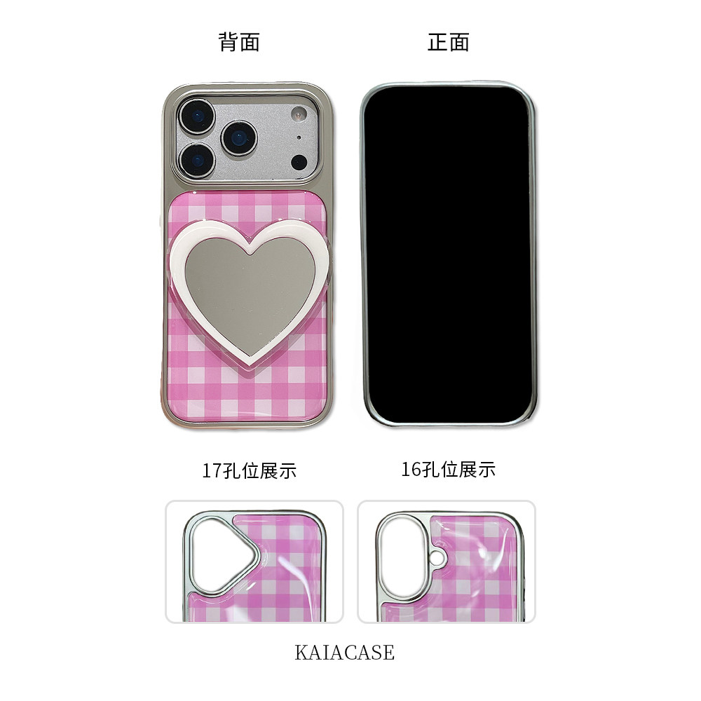 kaia 日韩ins粉格纹爱心镜子适用苹果17promax手机壳iphone16pro新款16女17pro创意15pro全包滴胶防摔手机套