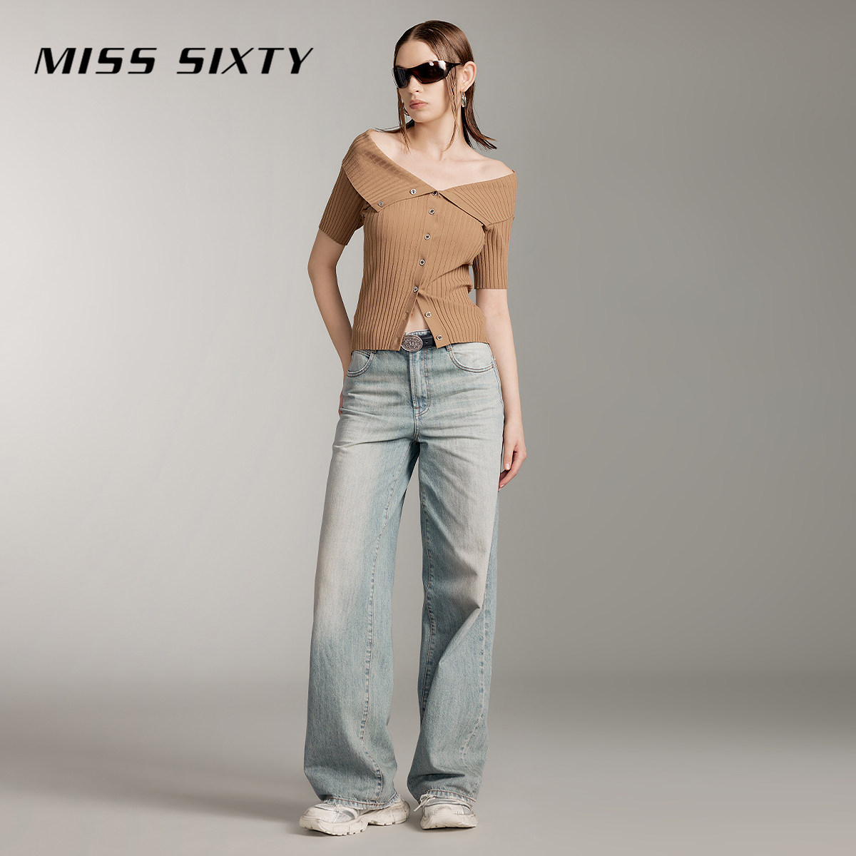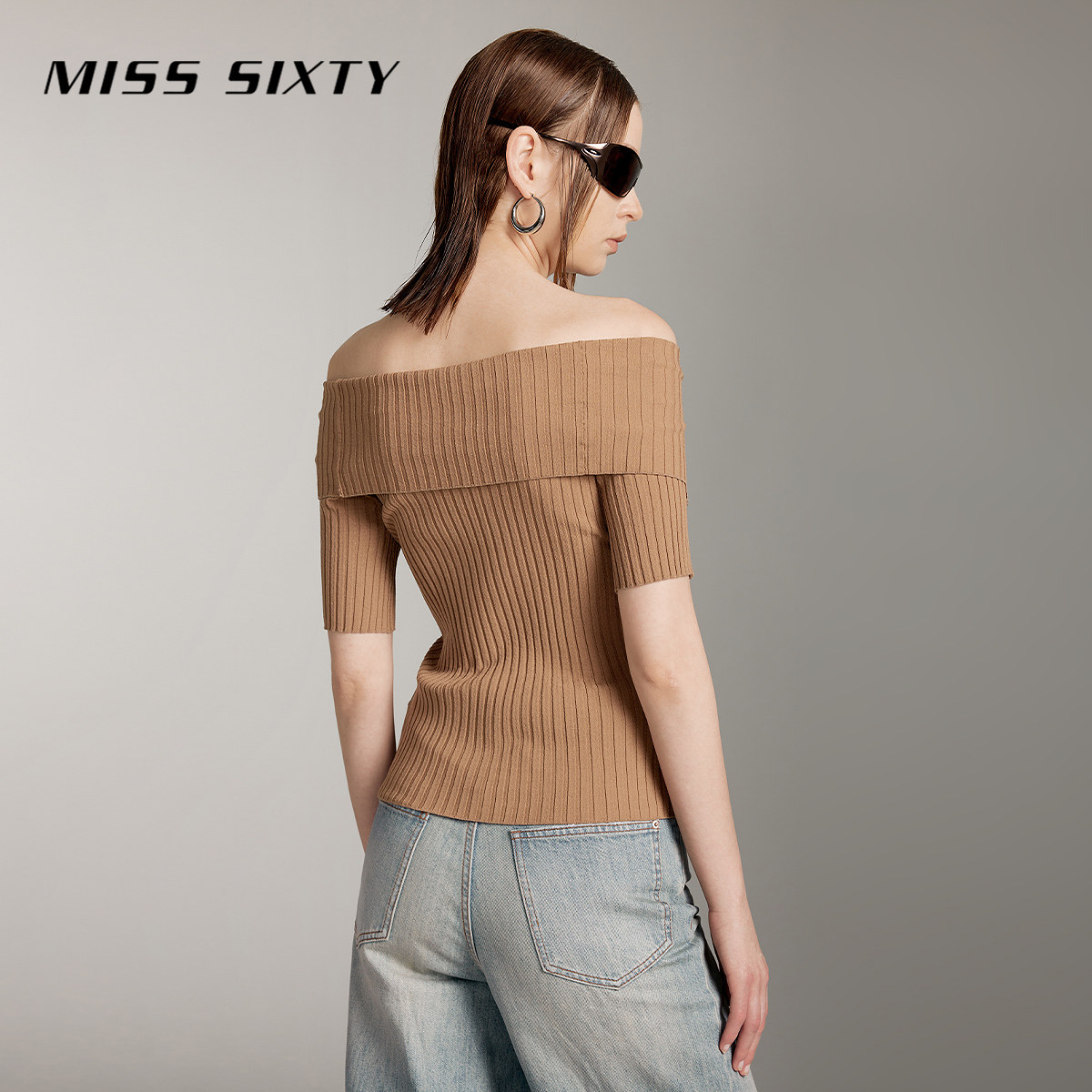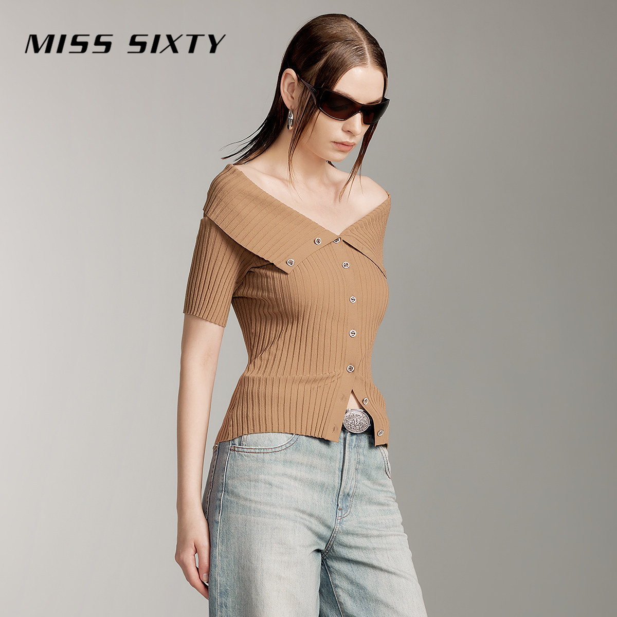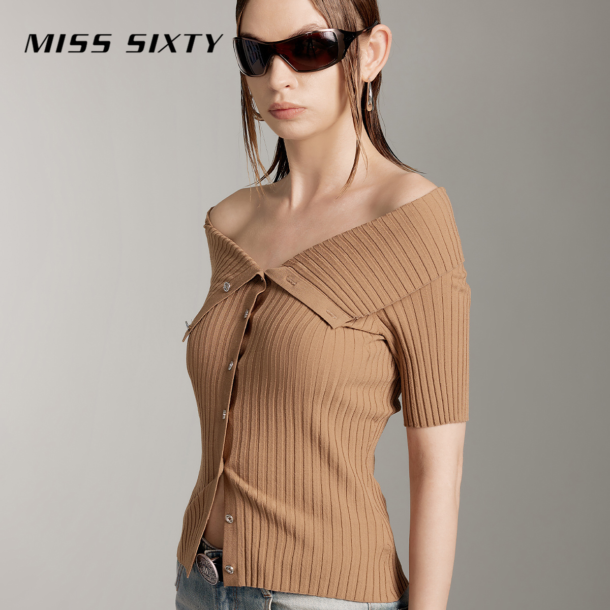Miss Sixty薄款针织衫性感一字肩收腰辣妹BM风开衫毛衣